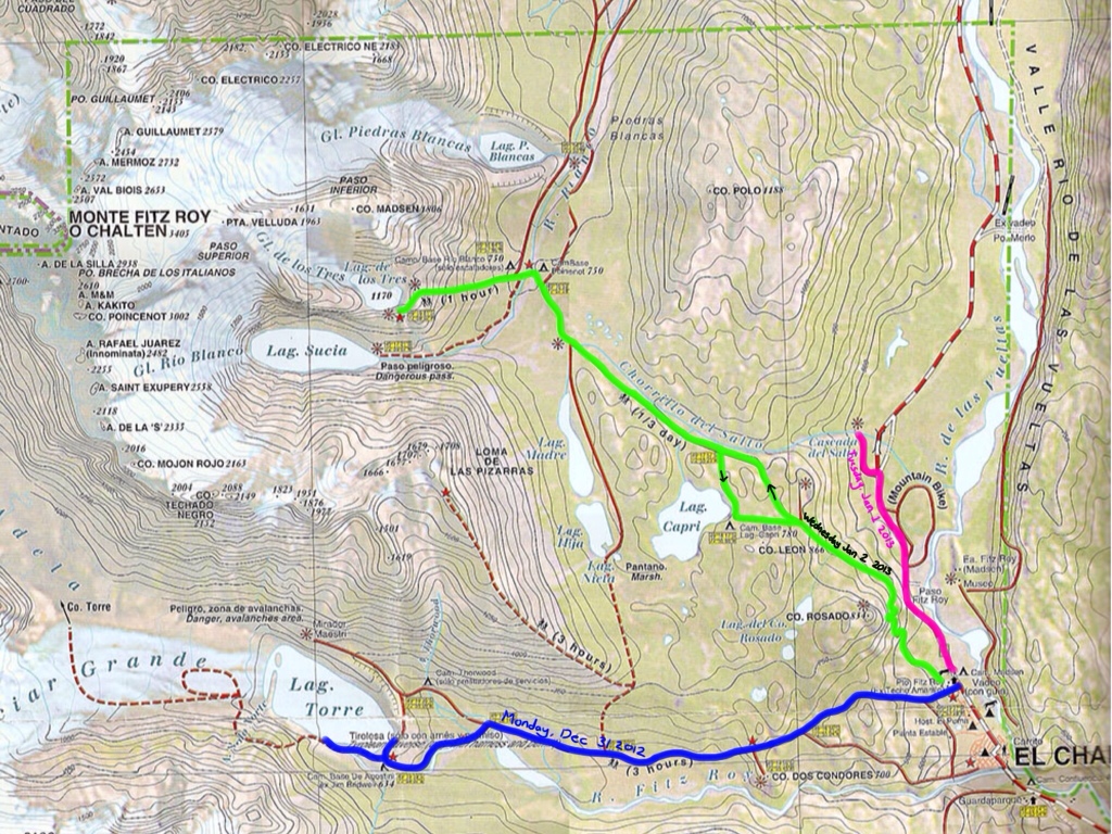 For the topographically-inclined people out there, Justin made this sweet map showing the hikes we did from El Chalten.
