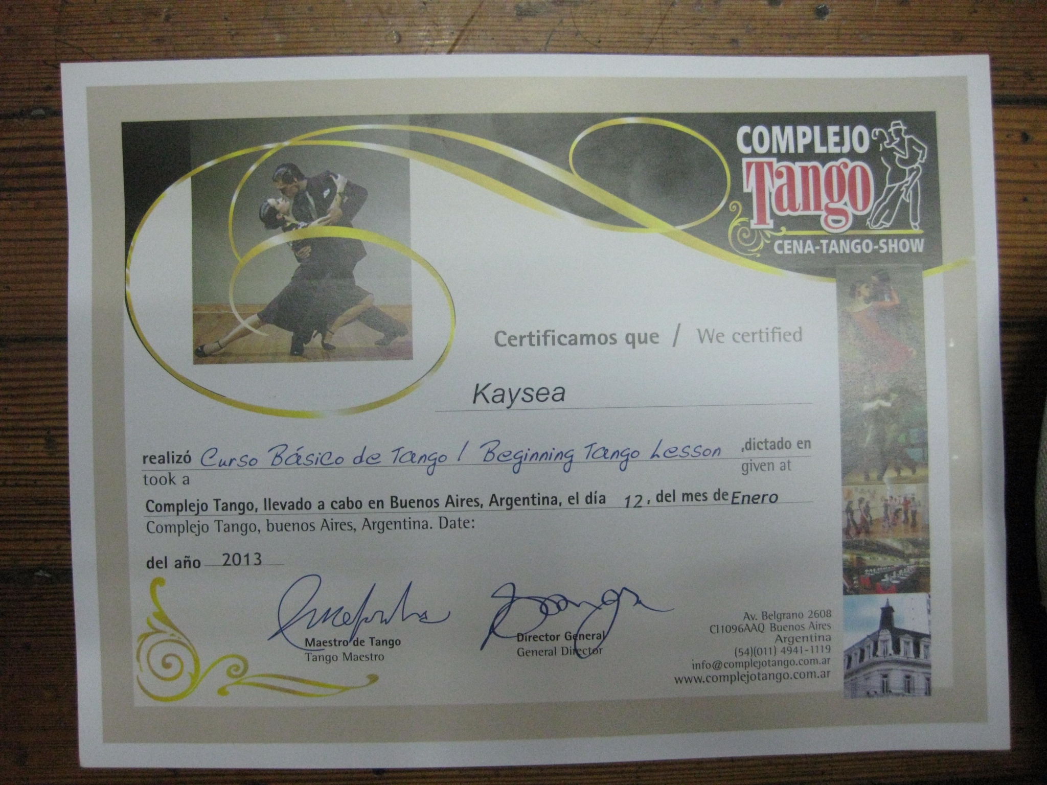 When we arrived at Complejo Tango, we were crammed into a tiny dance studio with about 100 other tourists. We were pretty much the last ones to arrive, so the lesson started about 5 minutes after we got there. Our maestra was hilarious, and split us up into boys and girls to learn the basic tango steps. Because there were so many people in the tiny, steamy room, we couldn't all dance together. It was very entertaining to watch others learn to tango, and I'm sure people thought the same thing about us! But we made it through the lesson with lots of laughs and no injuries, and we had worked up an appetite in the process. By the end of the lesson, we knew how to do a very basic tango (notice that I did not say we were good at it…) and we had mastered our “tango faces”. This is the face you make when you do a tango pose; it's supposed to be a sexy, sultry, come-hither face, but it morphed into more of a blue steel / what's the smell / try really hard not to laugh face. Very entertaining. And we got certificates! I guess our masetra thought we were good enough to pass, despite my doubts.