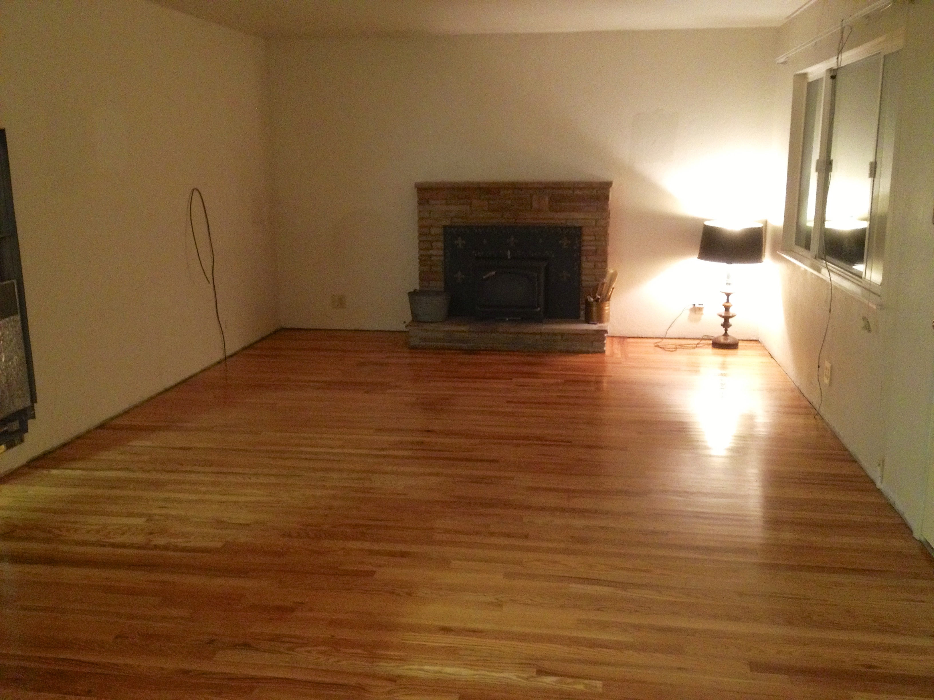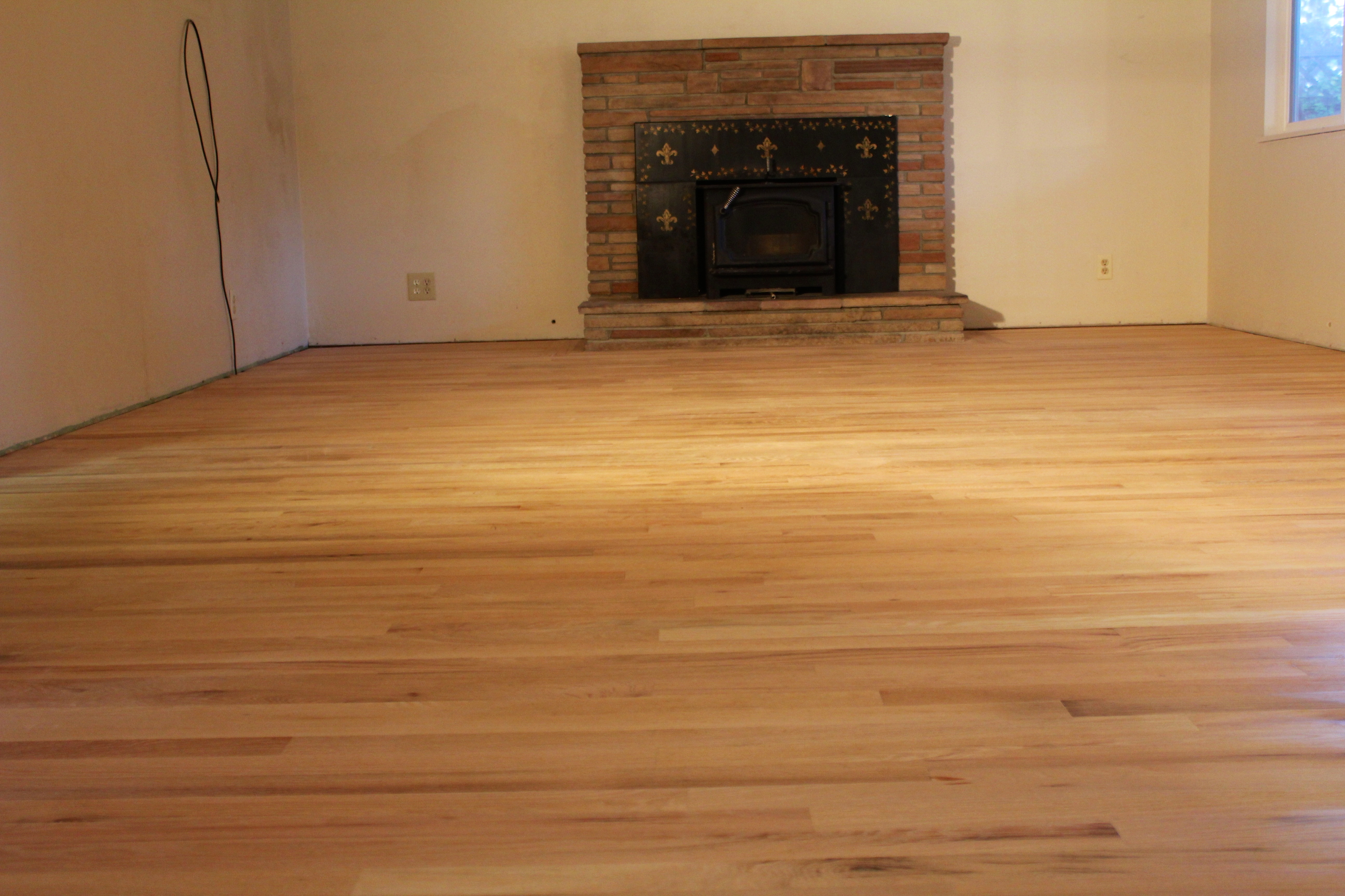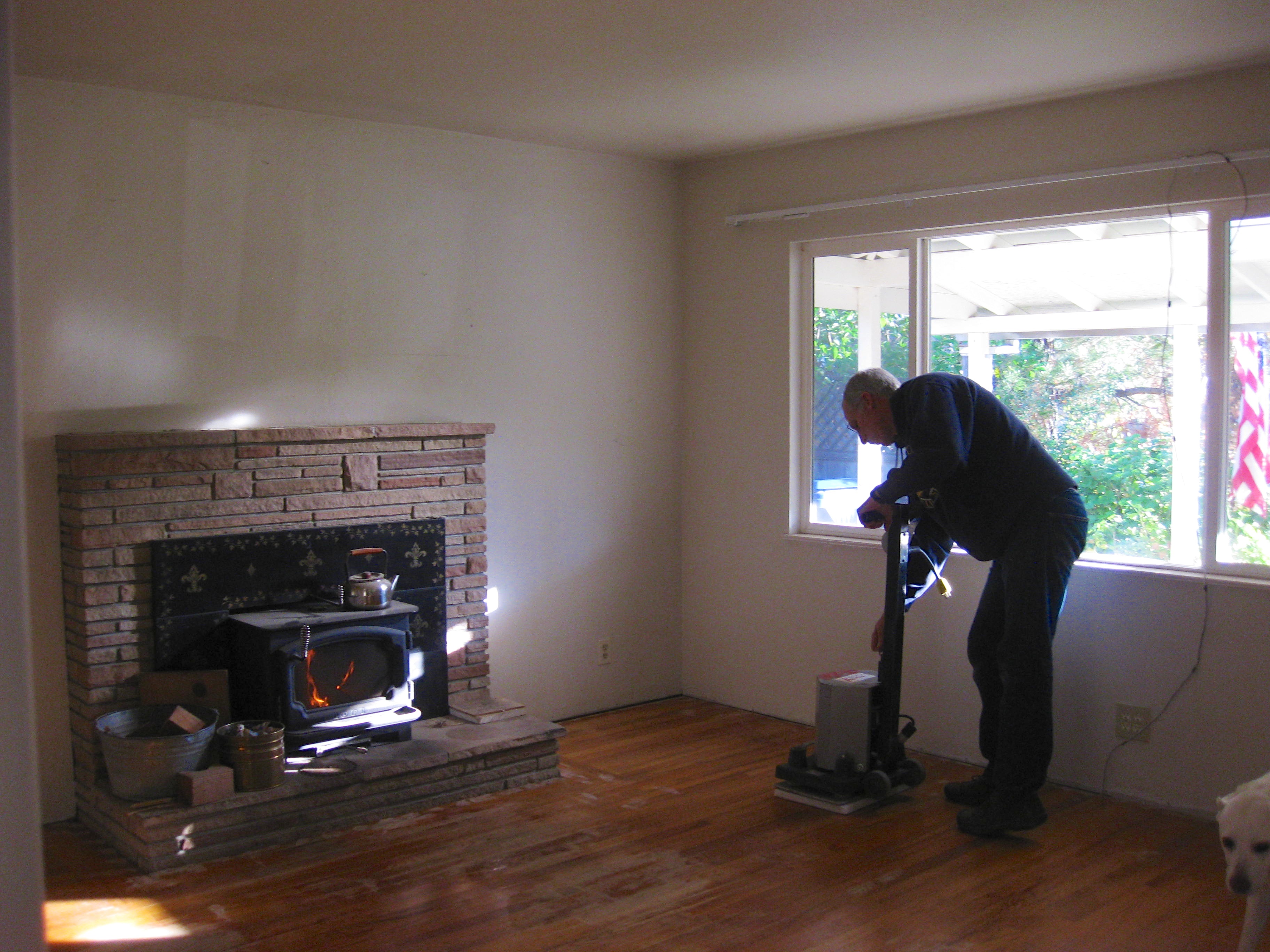 After two grueling days of sanding and vacuuming, our floors really started to look wonderful. Here’s the living room all sanded down, just before the first coat of finish: