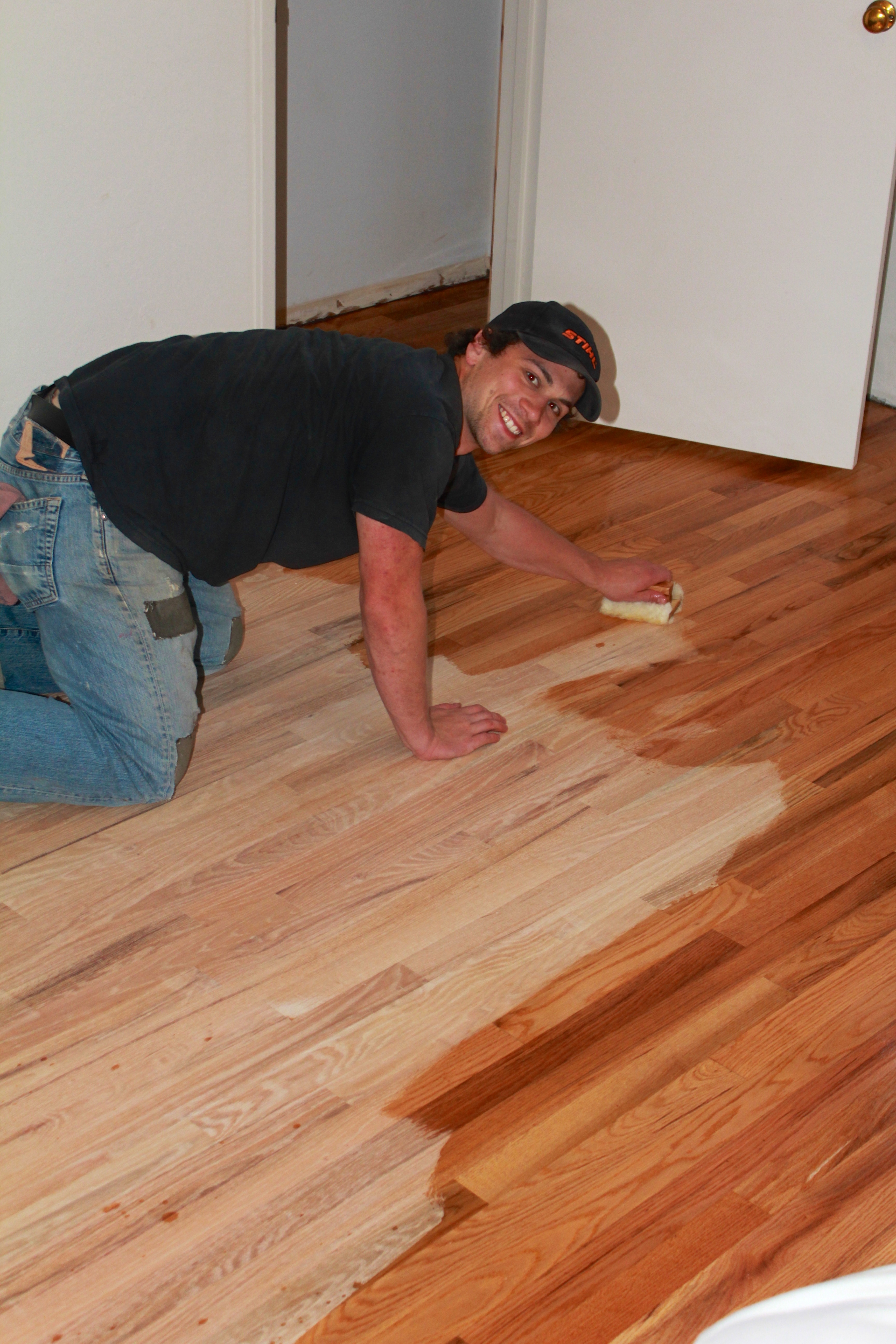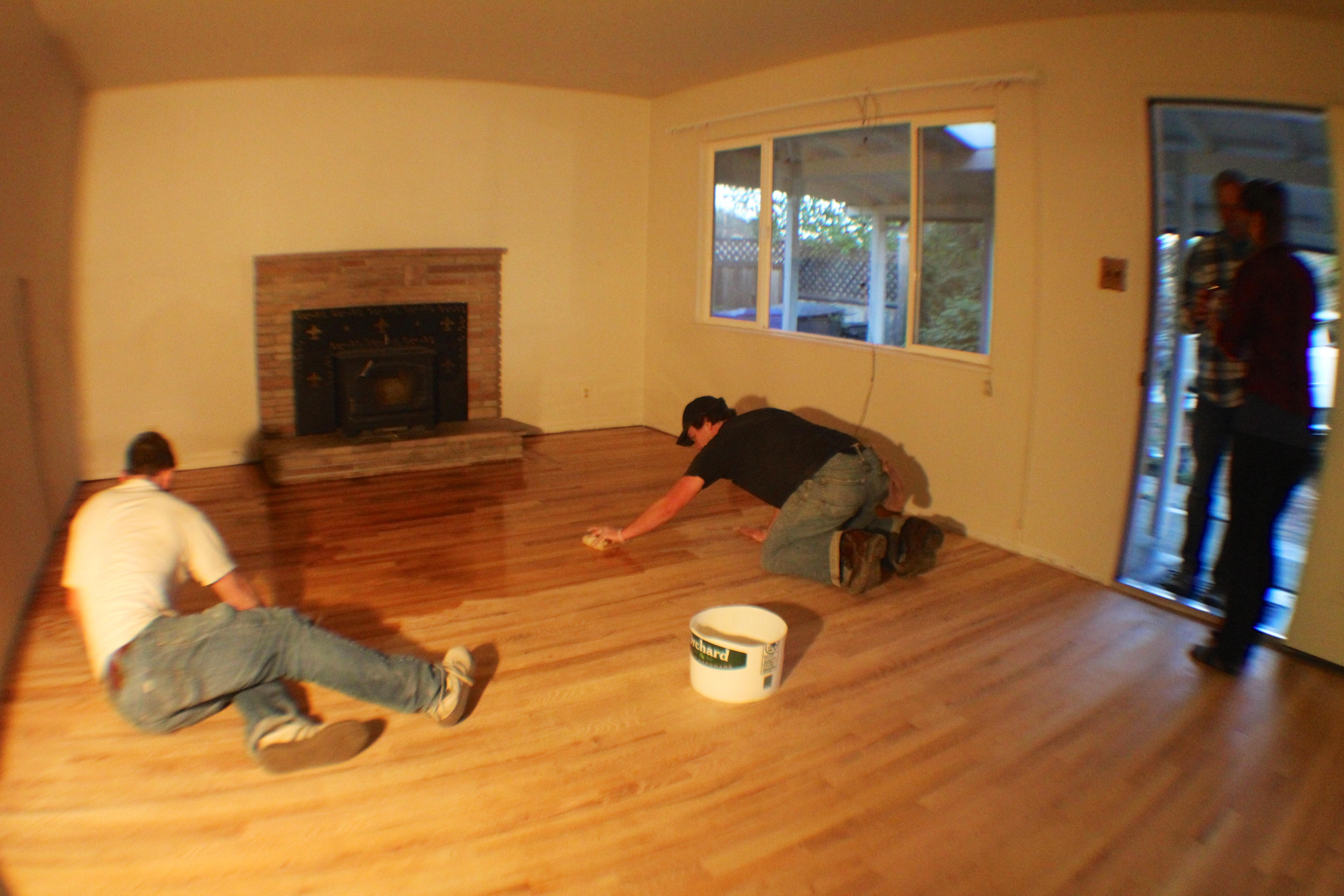 During our week back at work, Justin had figured out how to sand and stain the floors to perfection, and ran around getting all the equipment. After the floors were all prepped and the plan worked out, Justin, my dad, and our good friend Lucas went to town sanding the floors. As a side note, our good friend Lucas was visiting us from New Zealand. And we put him to work sanding our floors all weekend. Poor guy… talk about a good friend!