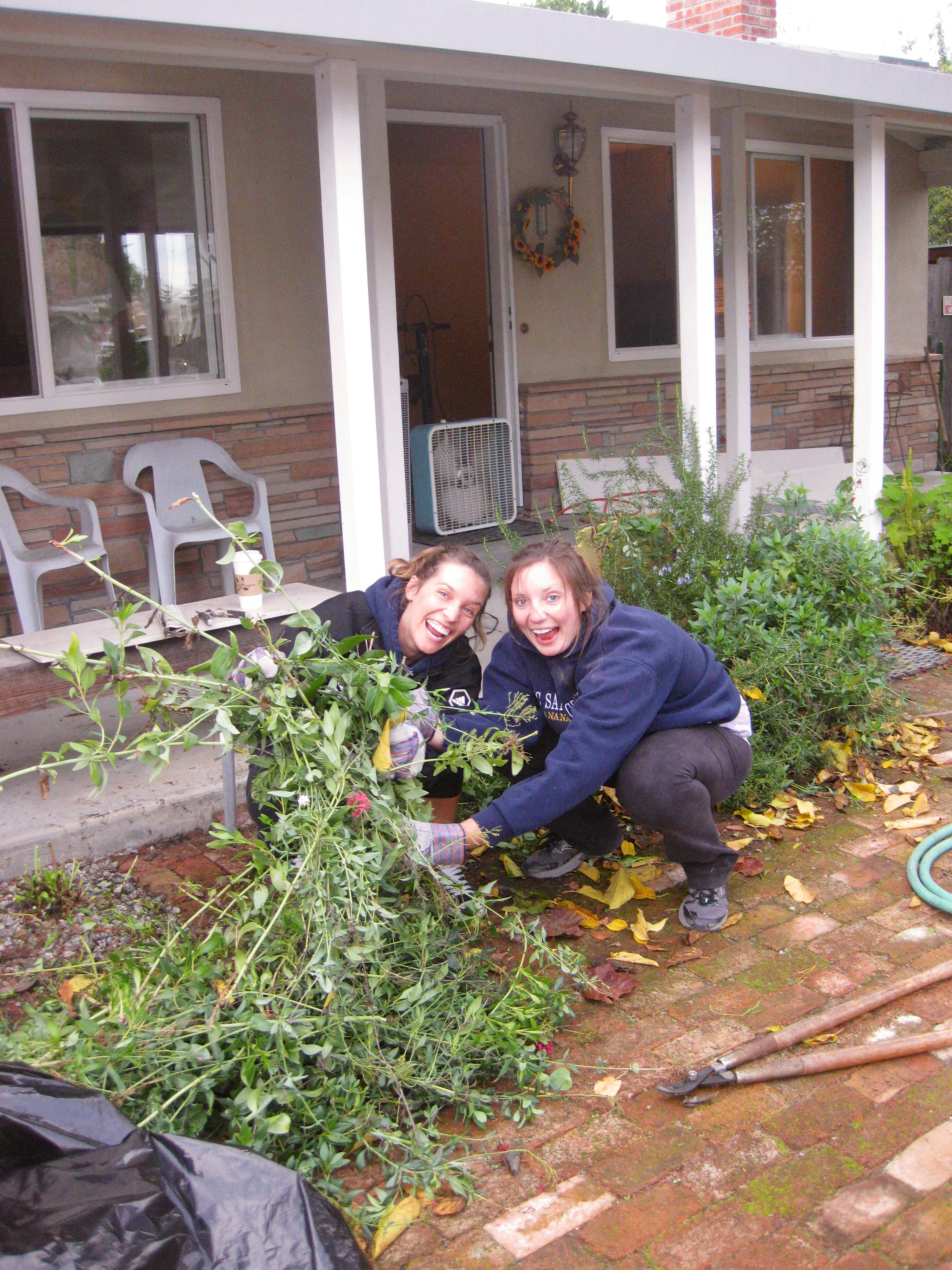 On the far side of our brick semi-circle driveway, Chels and Kimmi went to town on more weeds. I think they are having way too much fun…