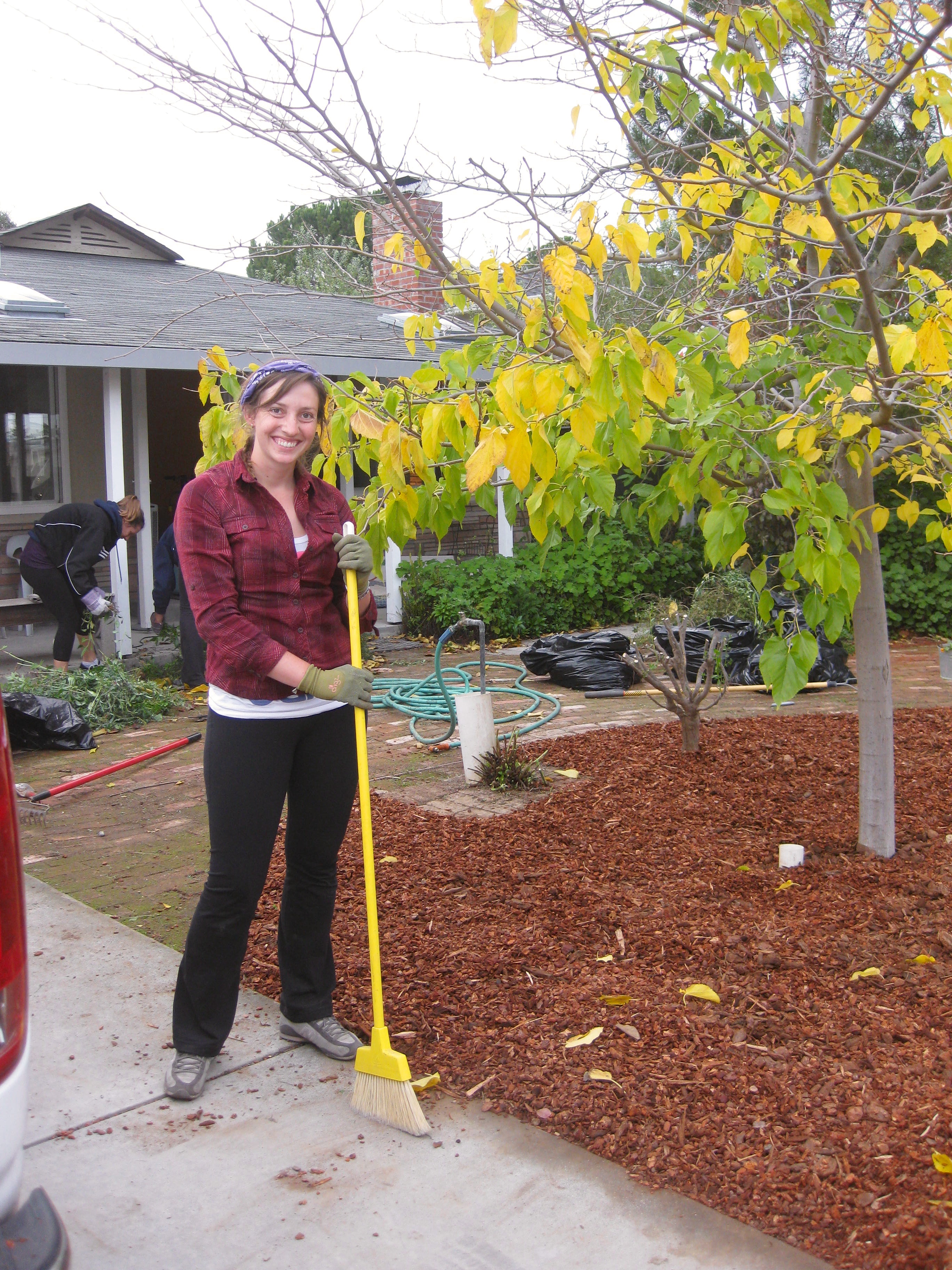 The post-weeding front yard left us with a mulberry tree and one plant. To try to keep the weeds at bay (who knew if we got them all?), we spread weed cloth over the dirt, and covered everything up with some redwood bark. This is a temporary fix to the front yard, until we figure out what else to do with it. But at least know when we come home, we don’t have the eyesore weed patch! Now, we have this: