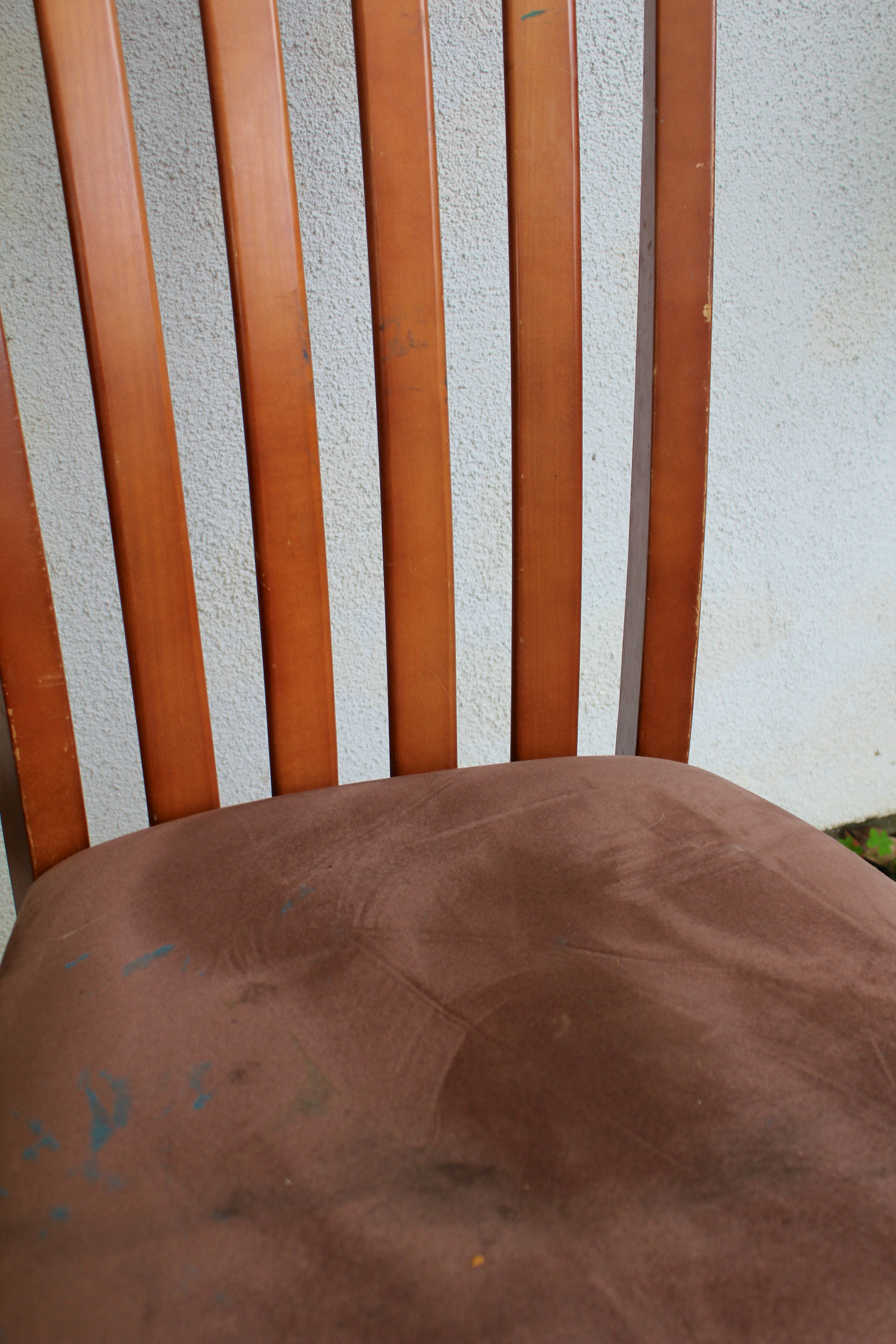 We’ll start with the chairs. We inherited a set of chairs from a family friend, and immediately saw the potential in them. While they had scuff marks galore, paint stains, and a few other indescribable sticky substances, we liked the mission-style backs and were very excited to have chairs with cushions. Even if those cushions are in desperate need of recovering! Without further ado, here is what we started with: