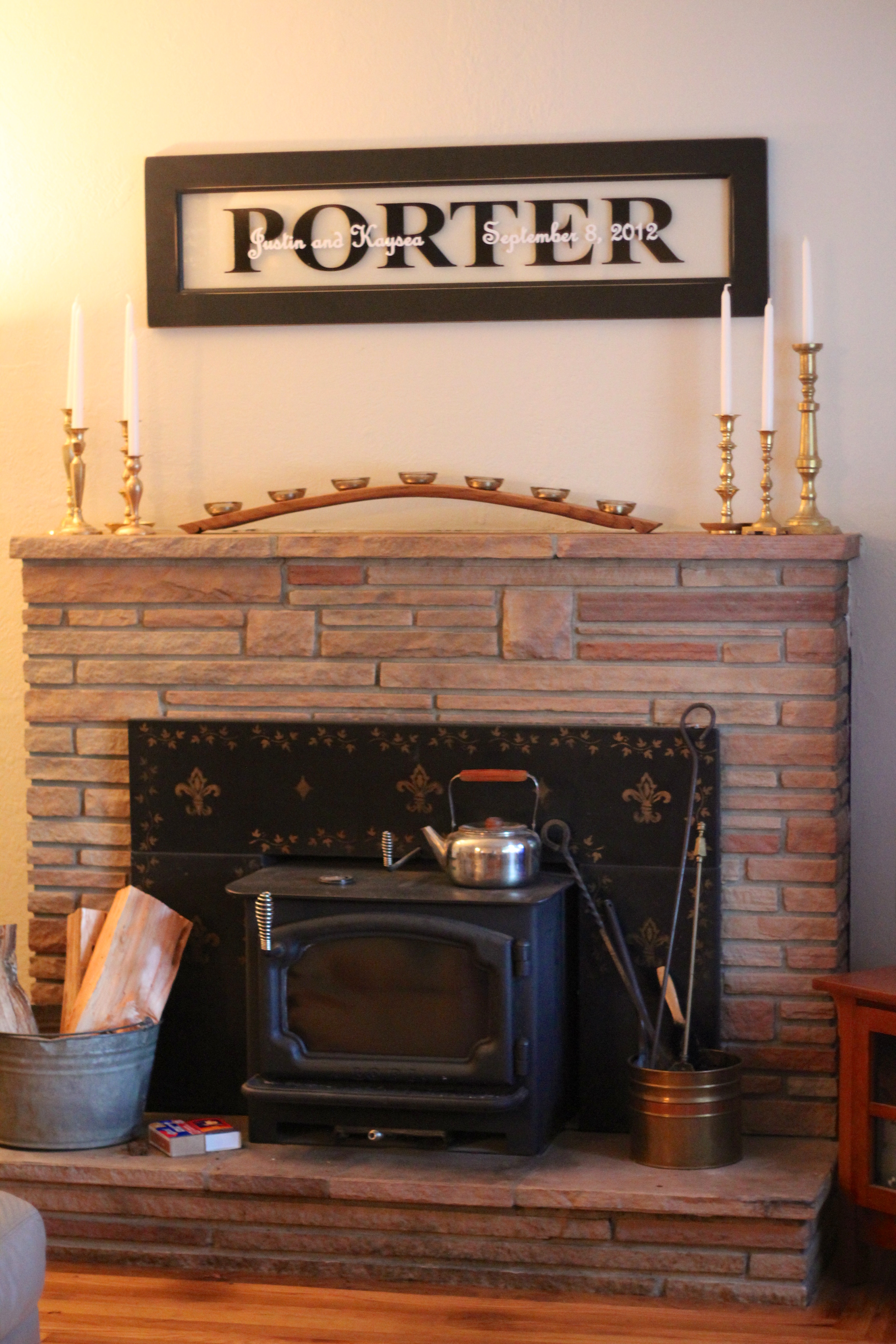 I should probably mention that our Porter sign was a wedding gift, courtesy of Dan and Brigitte. They also made the wine barrel stave with tea lights (right between all those candlesticks!). Such creative, crafty people 🙂 Our big to-do for this area is to paint over the fleur-de-lis on the plate around the stove. Then we’ll be good to go (for now, at least!).