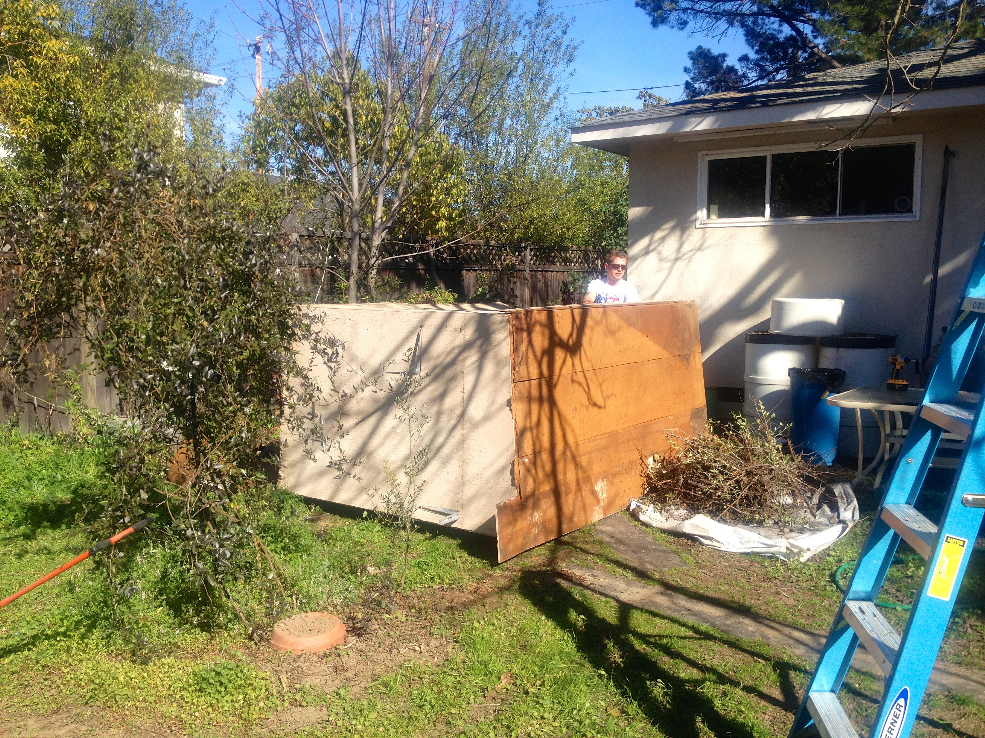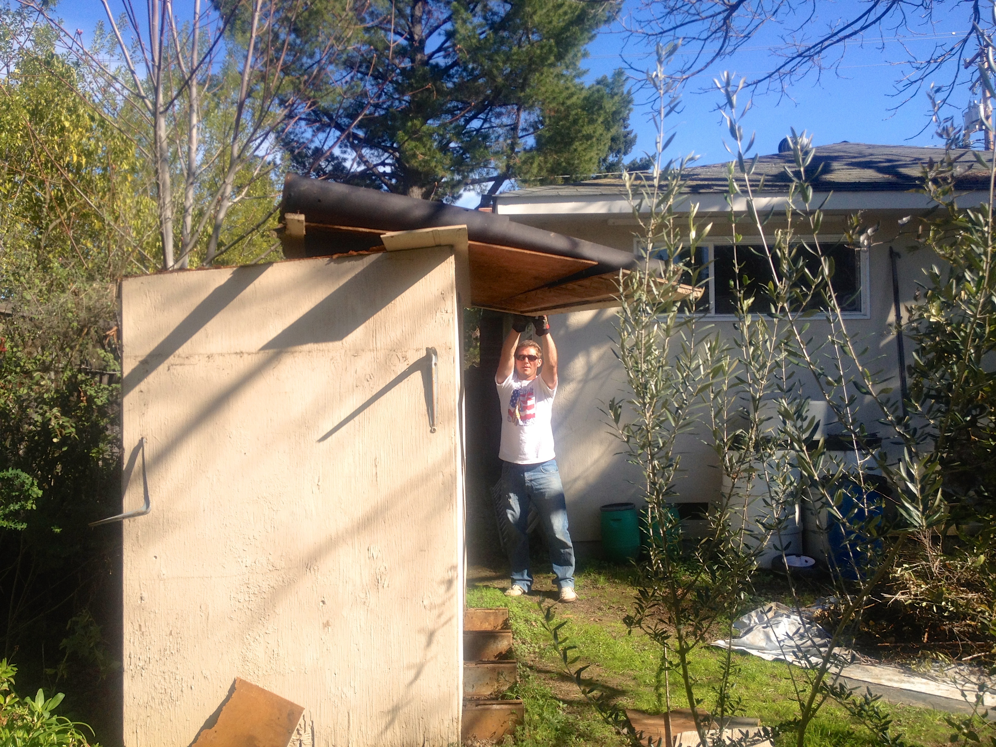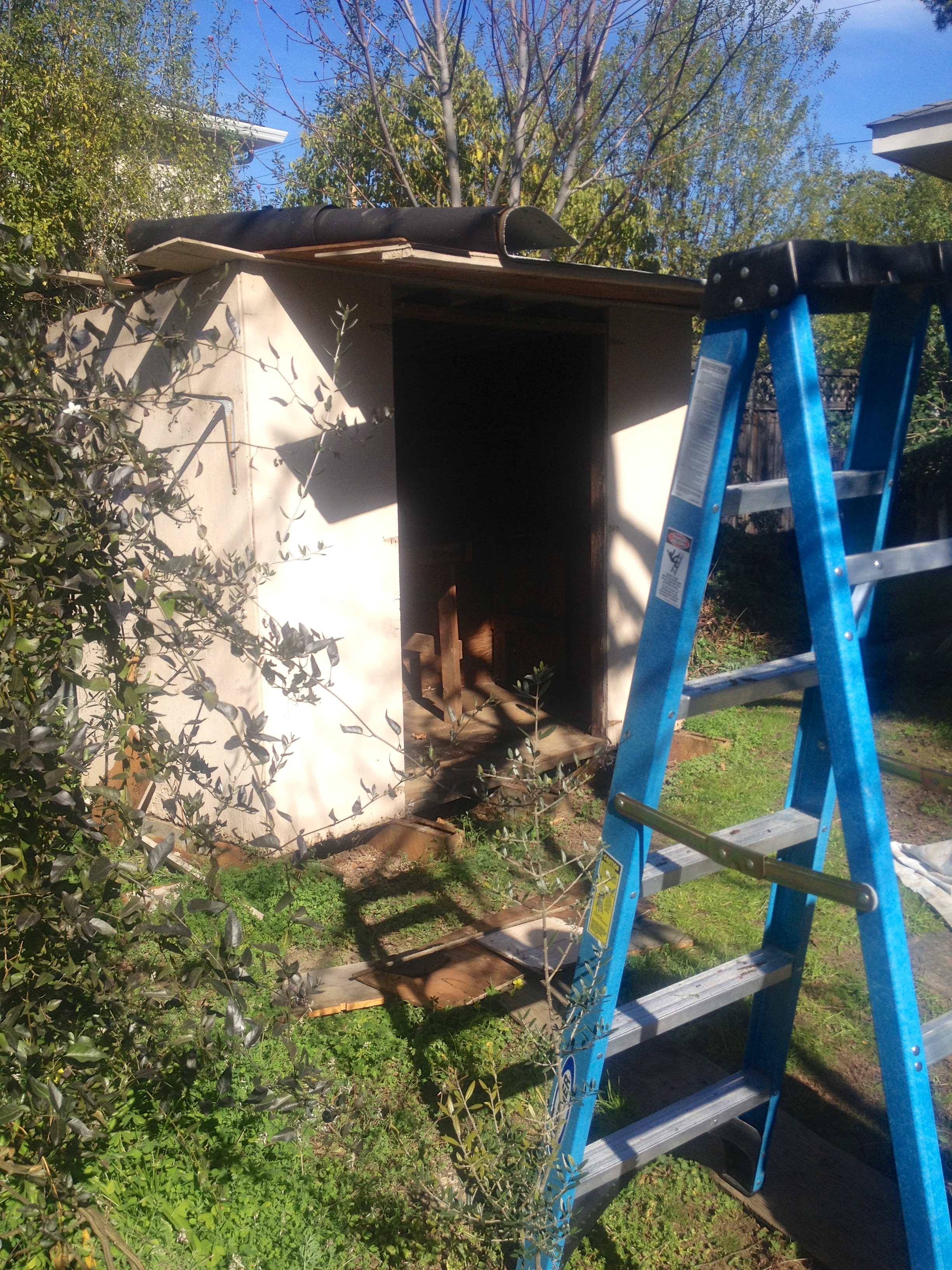 The spring weather lately has inspired us to get down and dirty in the backyard. As you can tell, we started with lots of weeds, some interesting yard art, and a few ramshackle sheds that really needed to go. We haven’t finalized our vision for the backyard yet, but we do know that we would like to have fruit trees and a few raised garden beds along this fence. So, the shed must go!