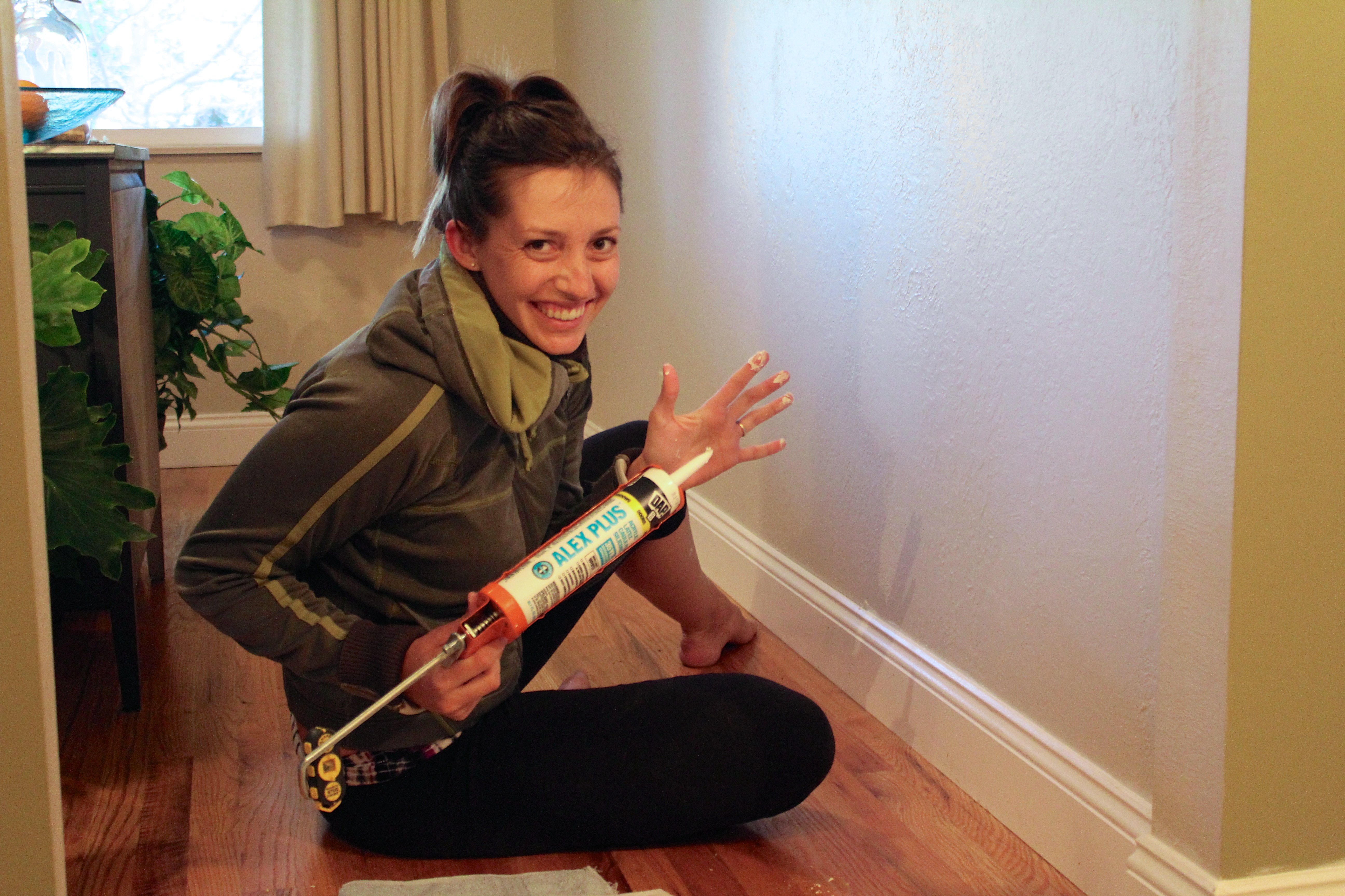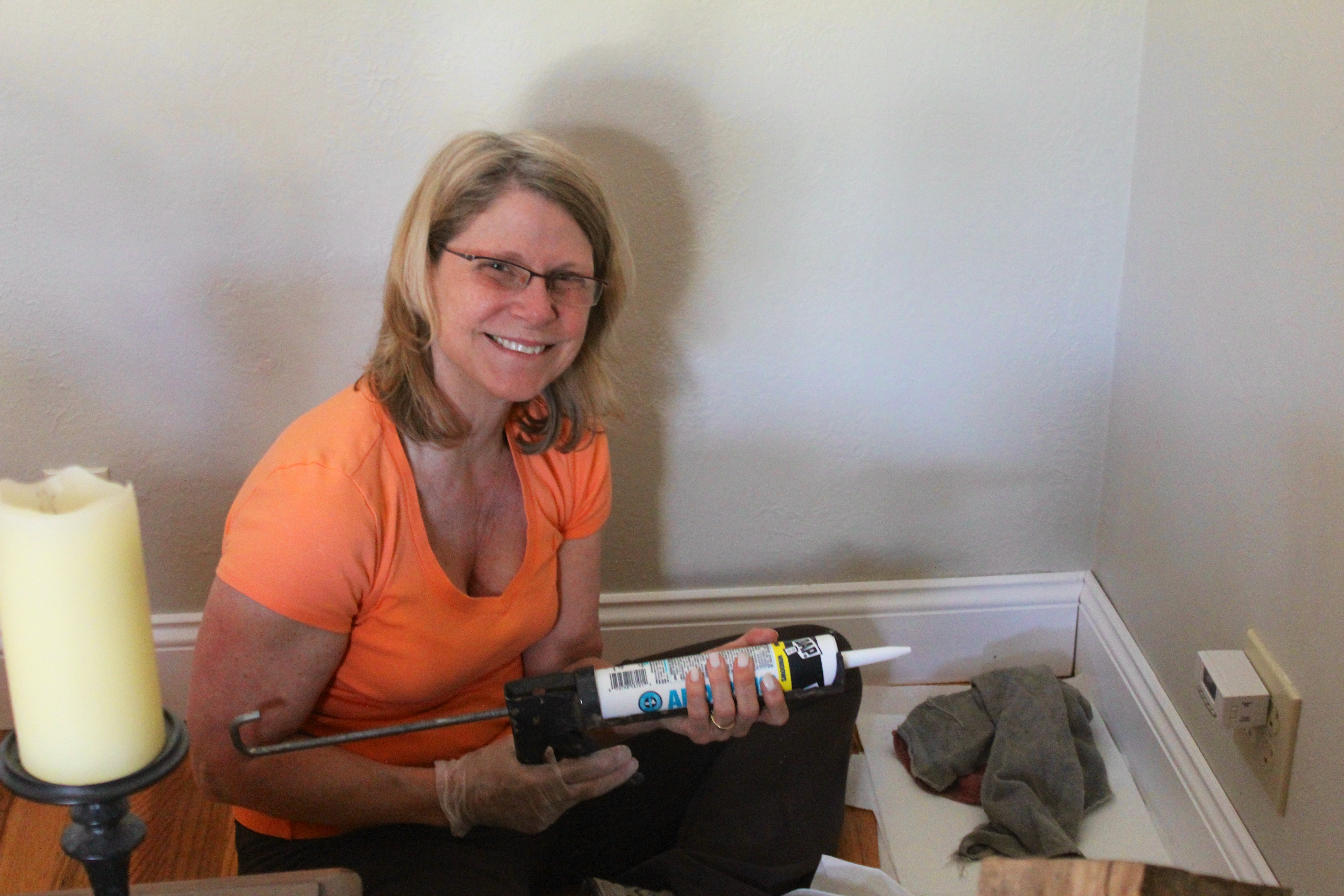Justin and Dirk measured and cut the baseboard (and re measured and recut at times!) while Nancy and I ran around moving furniture, cleaning, nailing the baseboards in, and caulking the nail holes and the spaces along the top of the baseboard (you know, that gap between the baseboard and the wall). We were such a mess by the end of the day, covered in saw dust and dried caulk. But we had accomplished our mission and finished it all in one day!