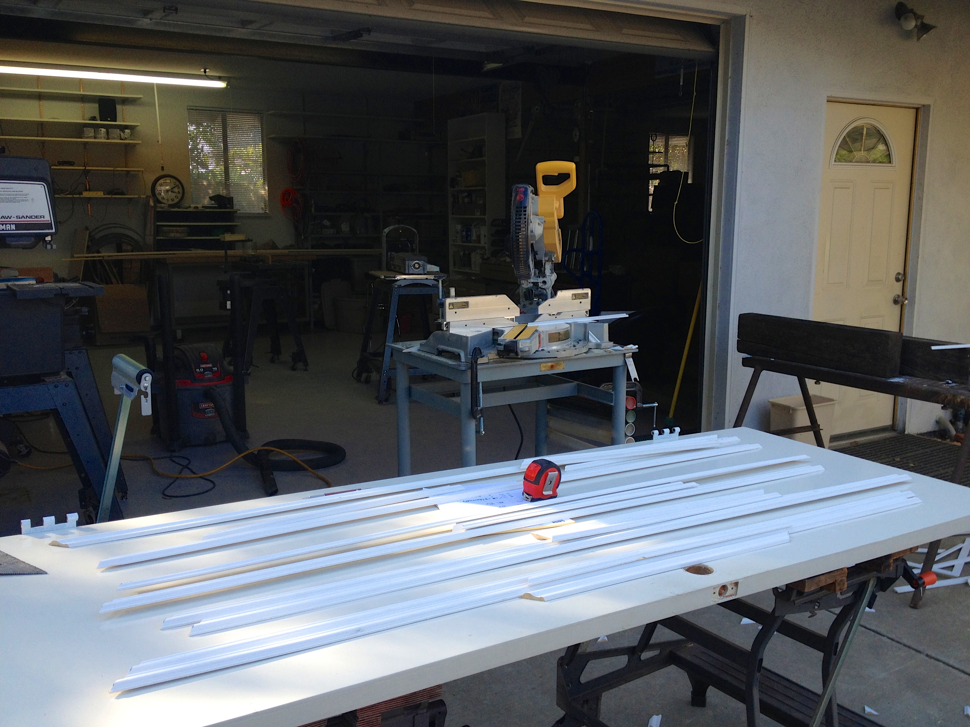 When we went to pick up our quarter round, we also picked up some 1-inch trim for our doors. Back at home, Justin cut and glued/ nailed the trim onto the doors while I sanded and stained the quarter round. Then I followed behind Justin and caulked between all of the trim and the doors, once the glue had dried. This makes the door and the trim look like one piece, an not like trim stuck on a door!