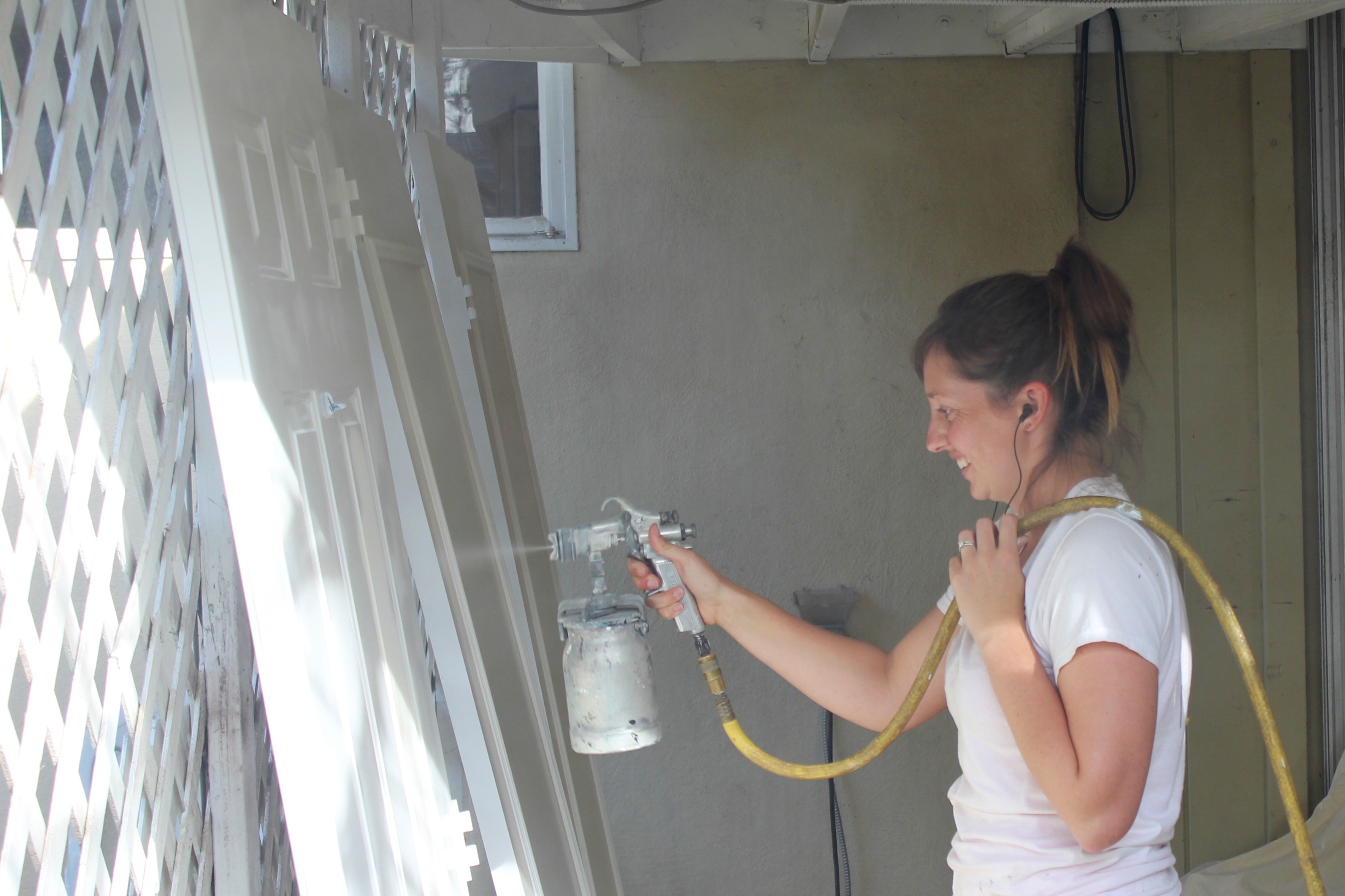 I spray painted those doors until I had cramps in my hands and forearms. Literally. And then I painted them again! And because the paint sprayer is rather loud, I listened to some awesome music and had a little dance party by myself. Justin found this quite entertaining. At least I can make him laugh!
