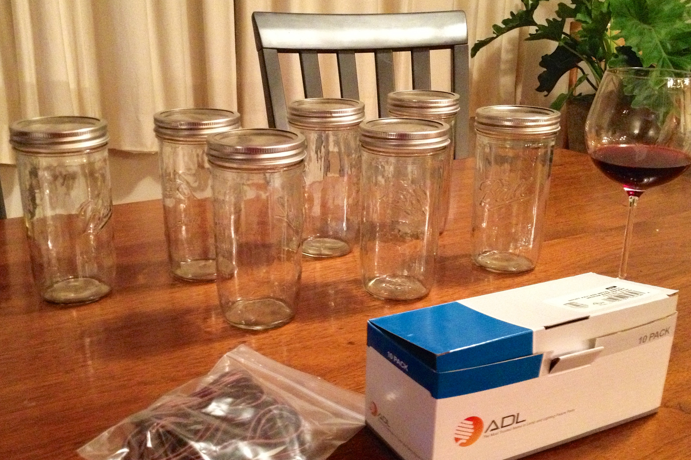 But I’m getting ahead of myself. Before we could do anything related to electricity, we had to design our chandelier. We settled on the longer, more slender mason jar style instead of the traditional more bulbous jars. We like the look of these jars better, but we also needed the extra jar height to ensure the light bulbs would fit inside with a little wiggle room. Which brings me to the next decision: light bulb types! When you have a lighting fixture with bare bulbs (or bulbs in clear glass jars), they are a definite focal point and they must be really cool. So we splurged a little bit on the light bulbs, and upgraded to the old school Edison-type light bulbs. And the splurge was worth it. Once we had our materials and our design all squared away (and delivered from that magical place called Amazon), we got to work.