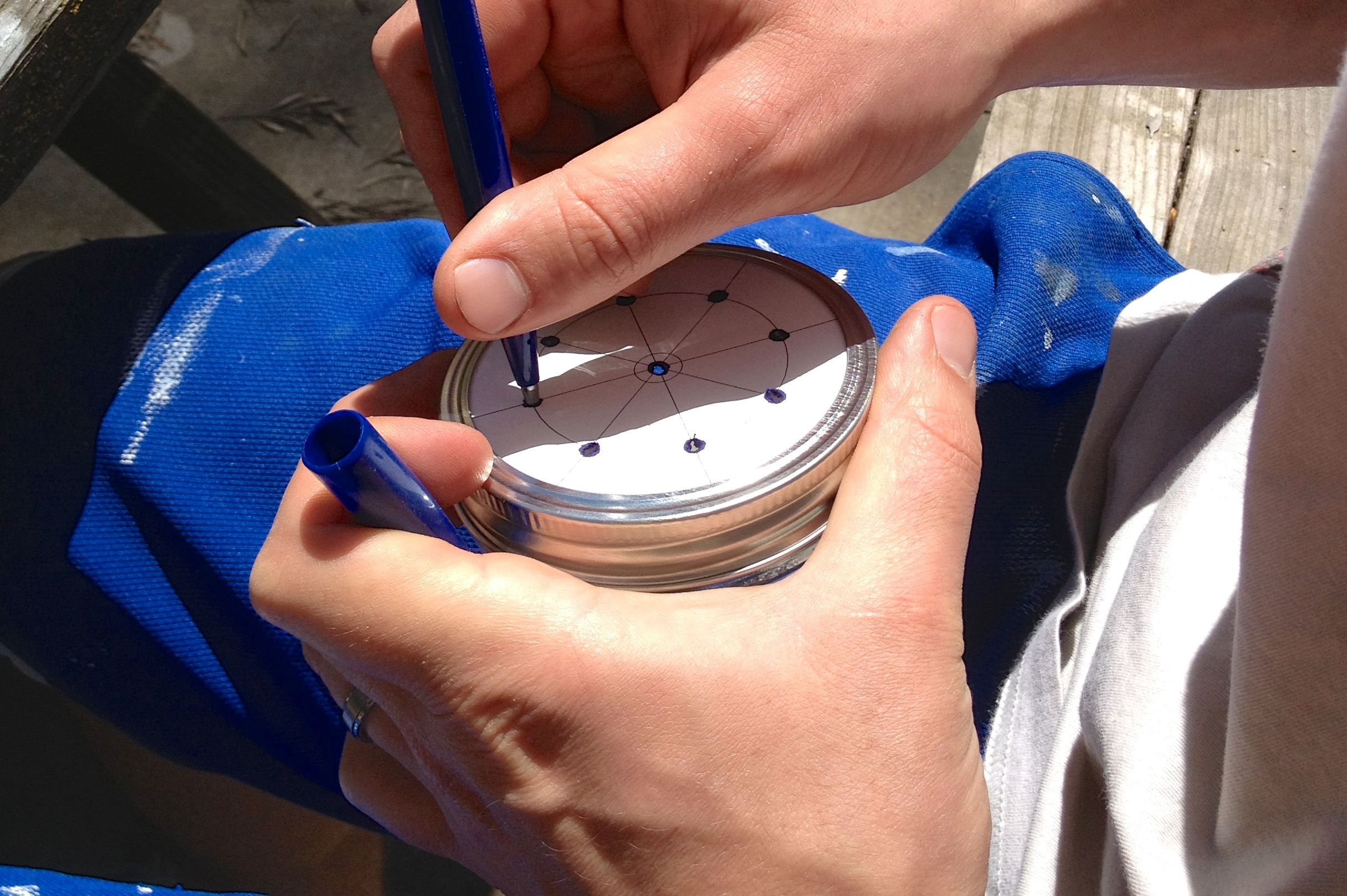 While the box was drying, we started constructing the jars. We had to drill a large hole in the center of each jar lid (for the light bulb and string to go through) and several small holes for heat to escape through. Have you ever tried to put a round hole in the dead center of a round lid? Sounds pretty easy, but it’s actually surprisingly difficult. Justin ended up making a template and printing it out, making the process a lot smoother!