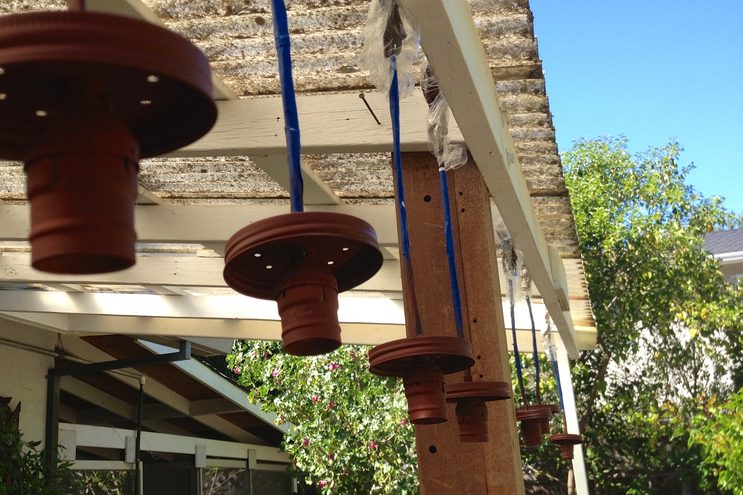 With the holes, drilled, we assembled the jar lids, light bulb sockets (I have no idea if this is the proper term?), and fabric-wrapped wire from which the jars were to hang. We protected the wire to keep it clean during painting, and painted the jar-lid apparatuses (apparati?). We had decided in the design phase that we didn’t want to leave the jar lids and light bulb sockets silver. Instead, we wanted them to match the fabric-wrapped wire and at least somewhat match the espresso stained wood. In essence, we wanted everything to be a shade of dark brown so the light reflecting from the bulbs would be warmer and less metallic.