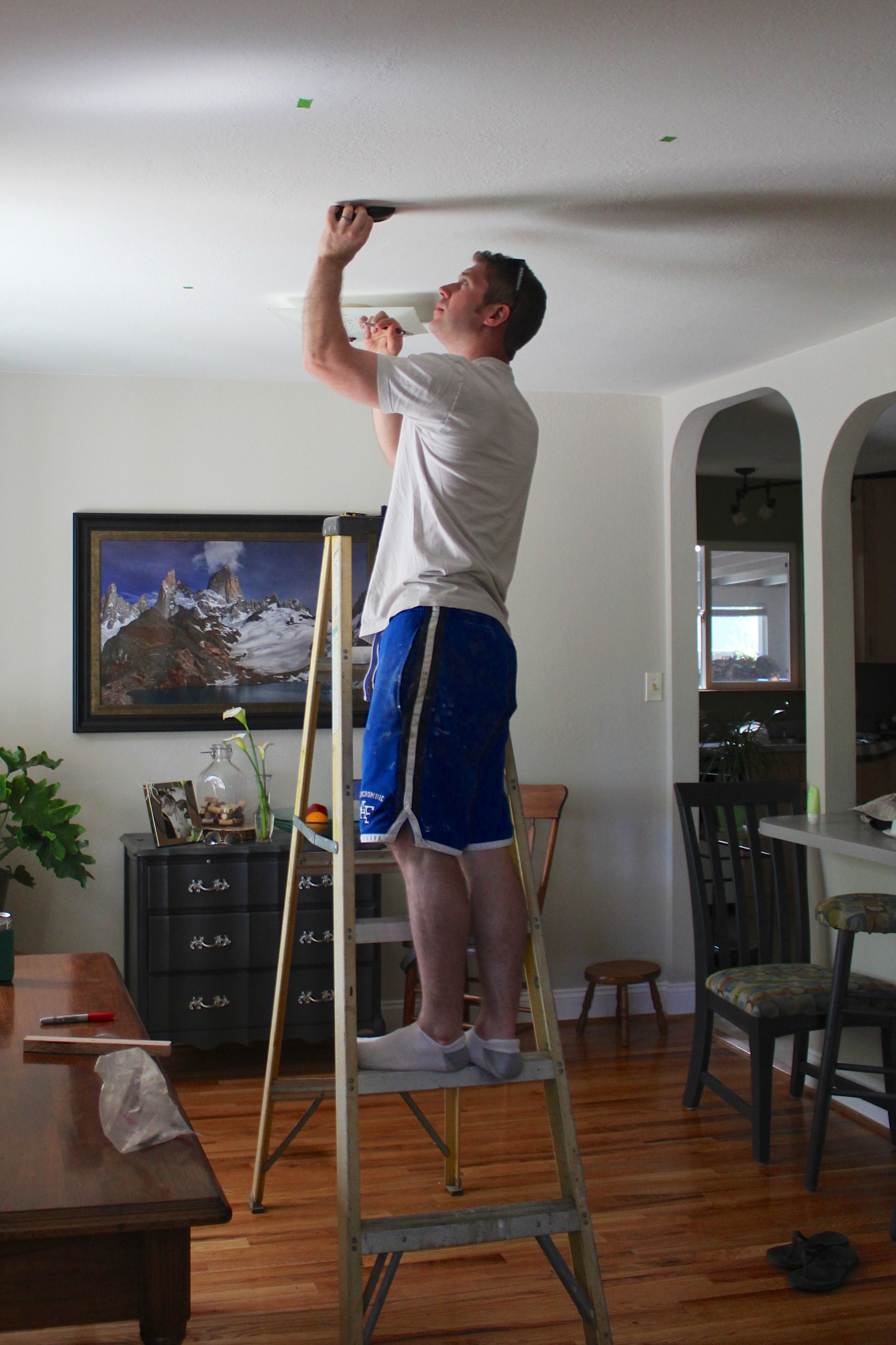 The lighting in the dining room has been driving Justin crazy for months. Probably since before we moved in. Don’t get me wrong, I’m not crazy about our dingy, uncentered light either. But I just figured it would be one of those things we would get around to changing eventually, when we had a little more time and money. Well, my assumption was completely incorrect. Apparently, I forgot who I am married to? Regardless of my miscalculated assumptions, my wonderful husband had big plans to change the lighting in our dining room, and to change it right now.