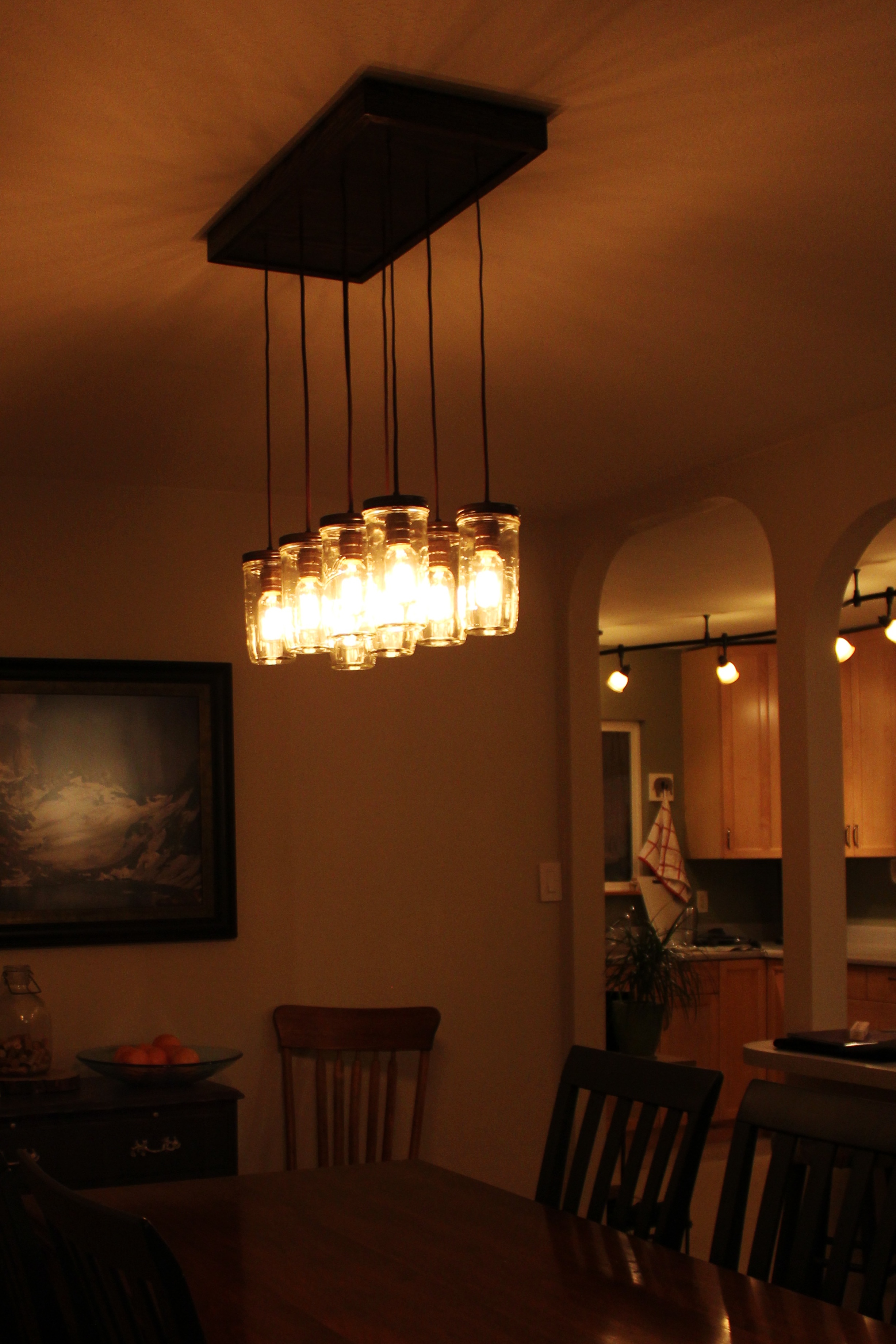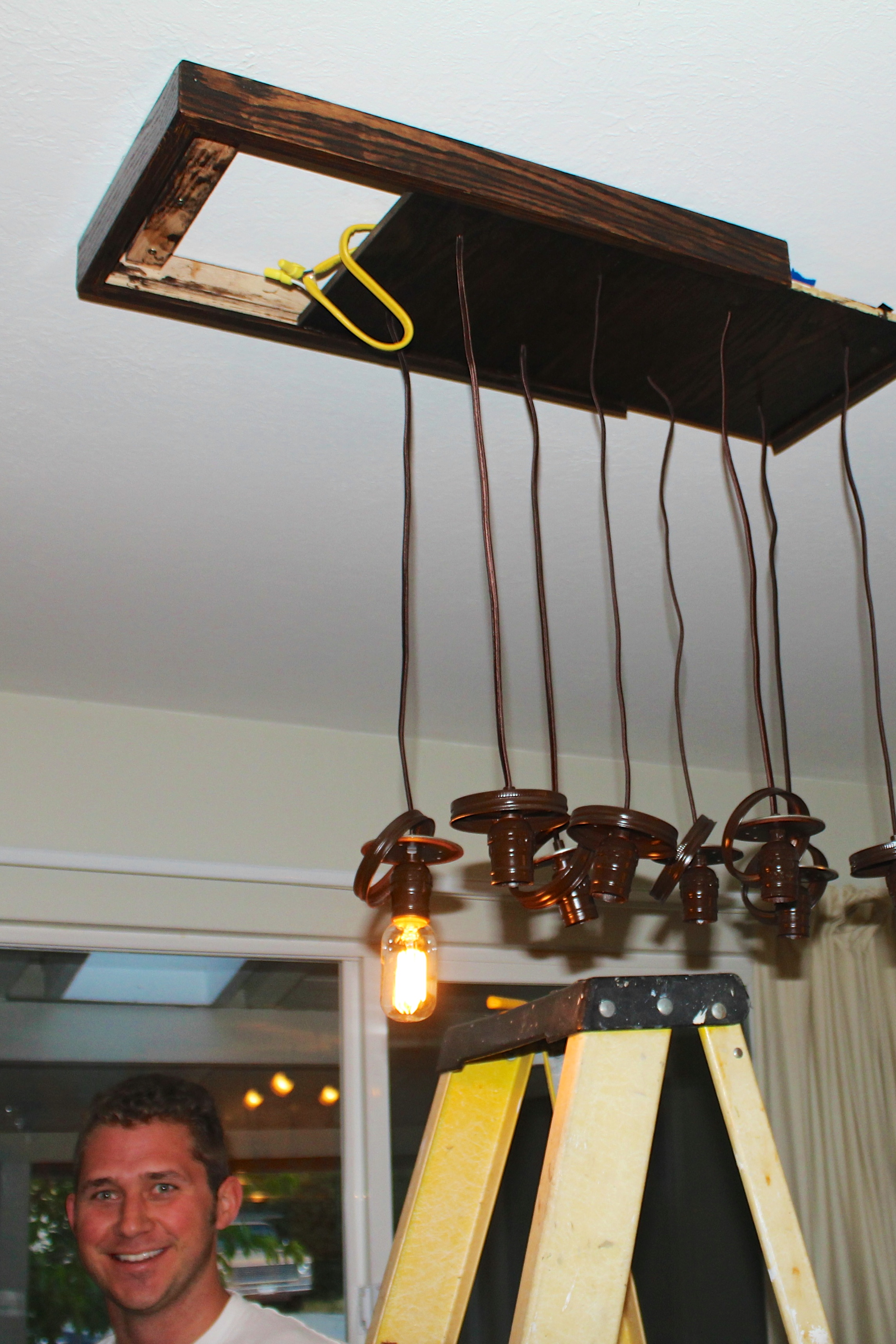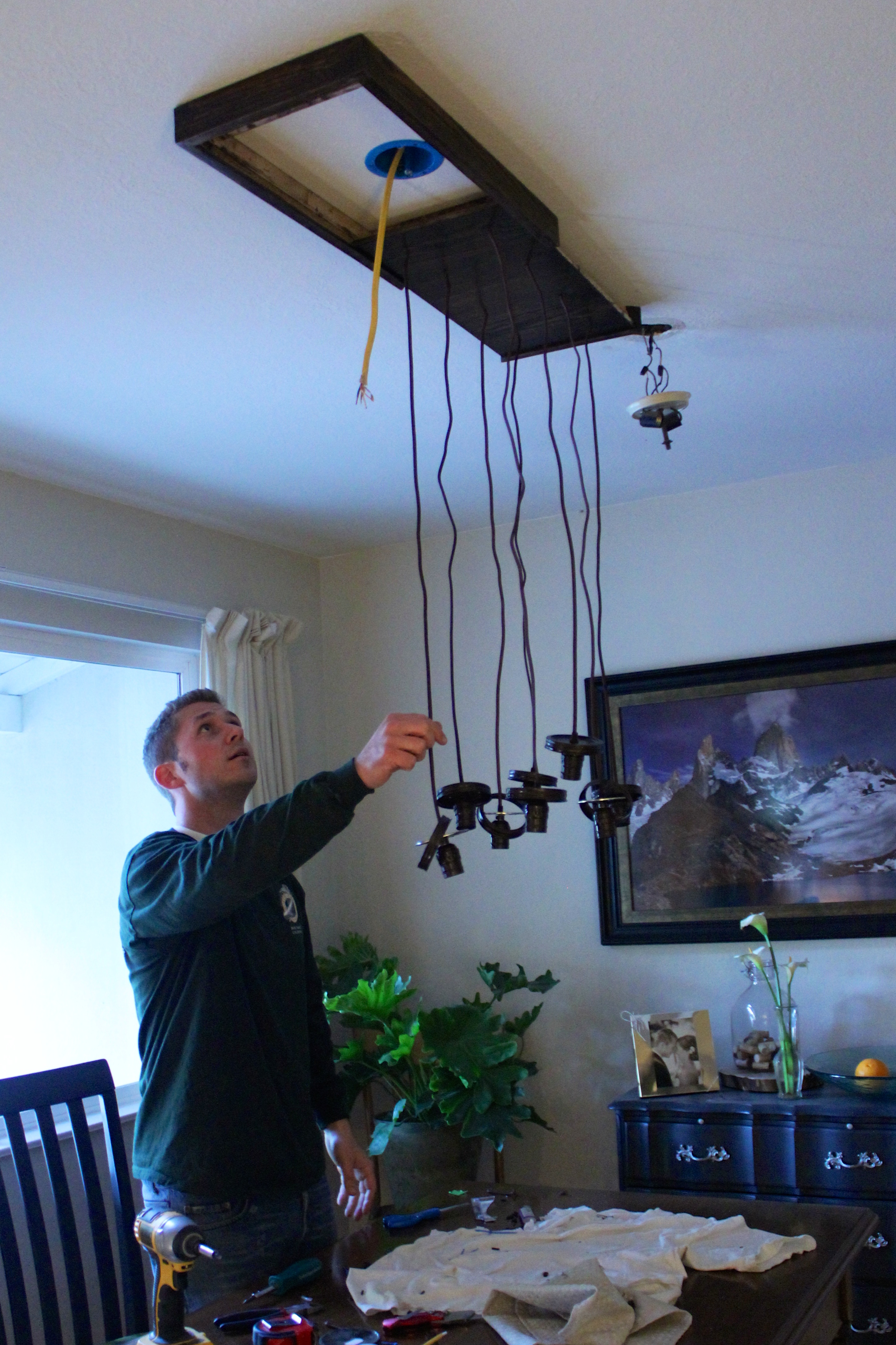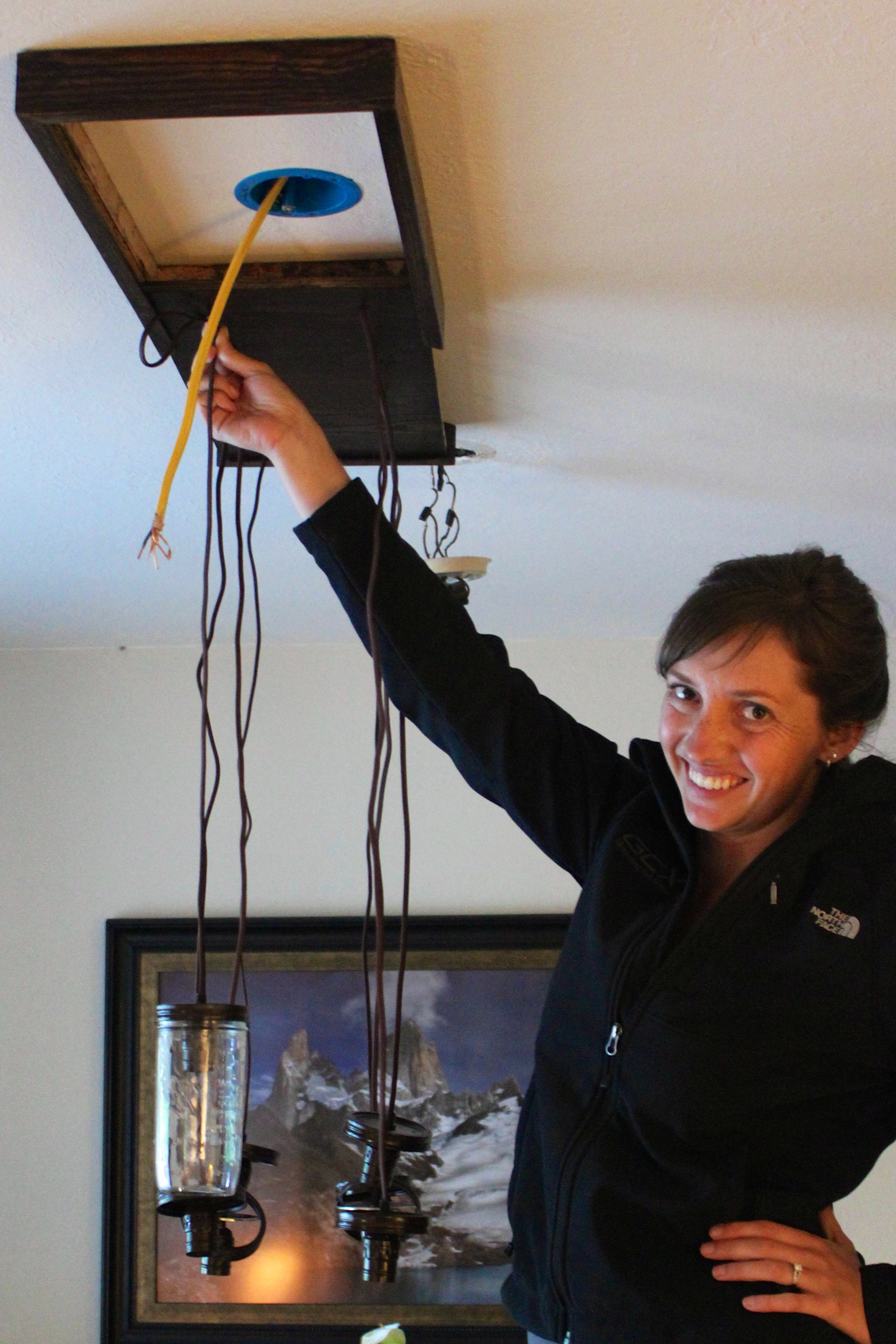 We had already decided where the chandelier was going to go, and had marked out exactly where the box would go on the ceiling. Now was the time to put it up! This was actually a relatively simple act, because Justin had designed it to be so. I just held up the box while Justin screwed it in, then slide in the second piece of the box to hide the wires, screws, junction box, etc., then we added the light bulbs, and finally the jars!