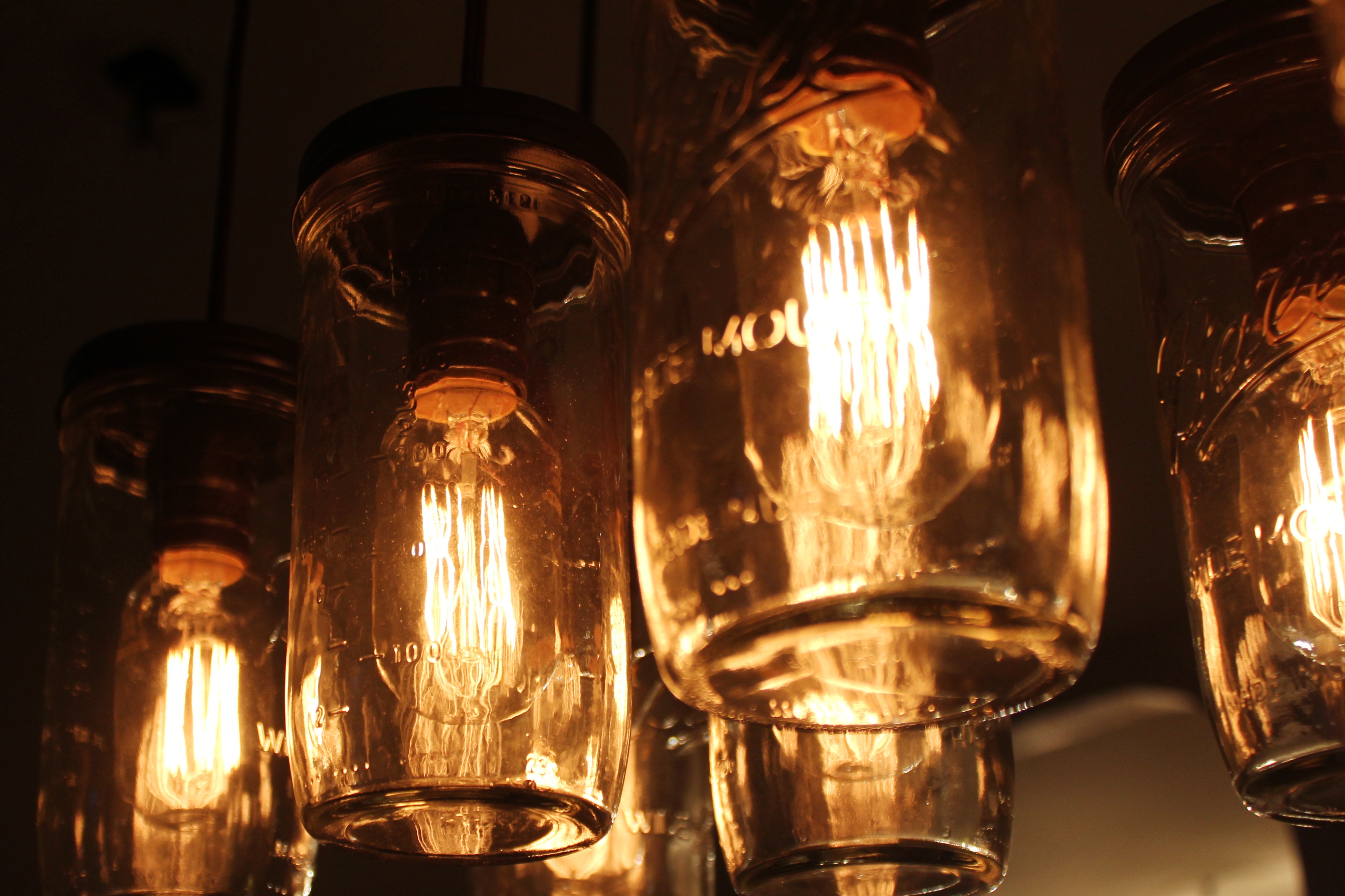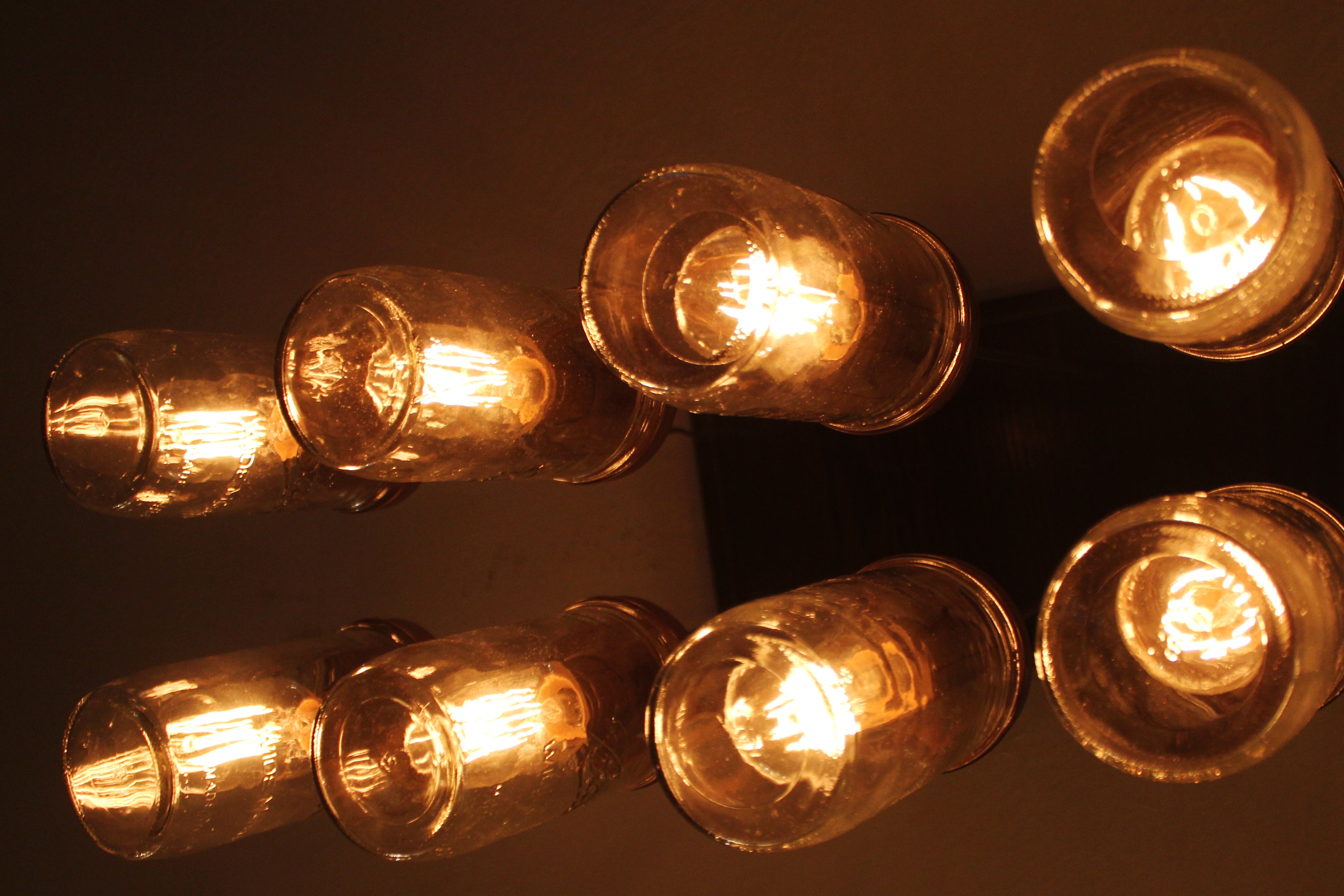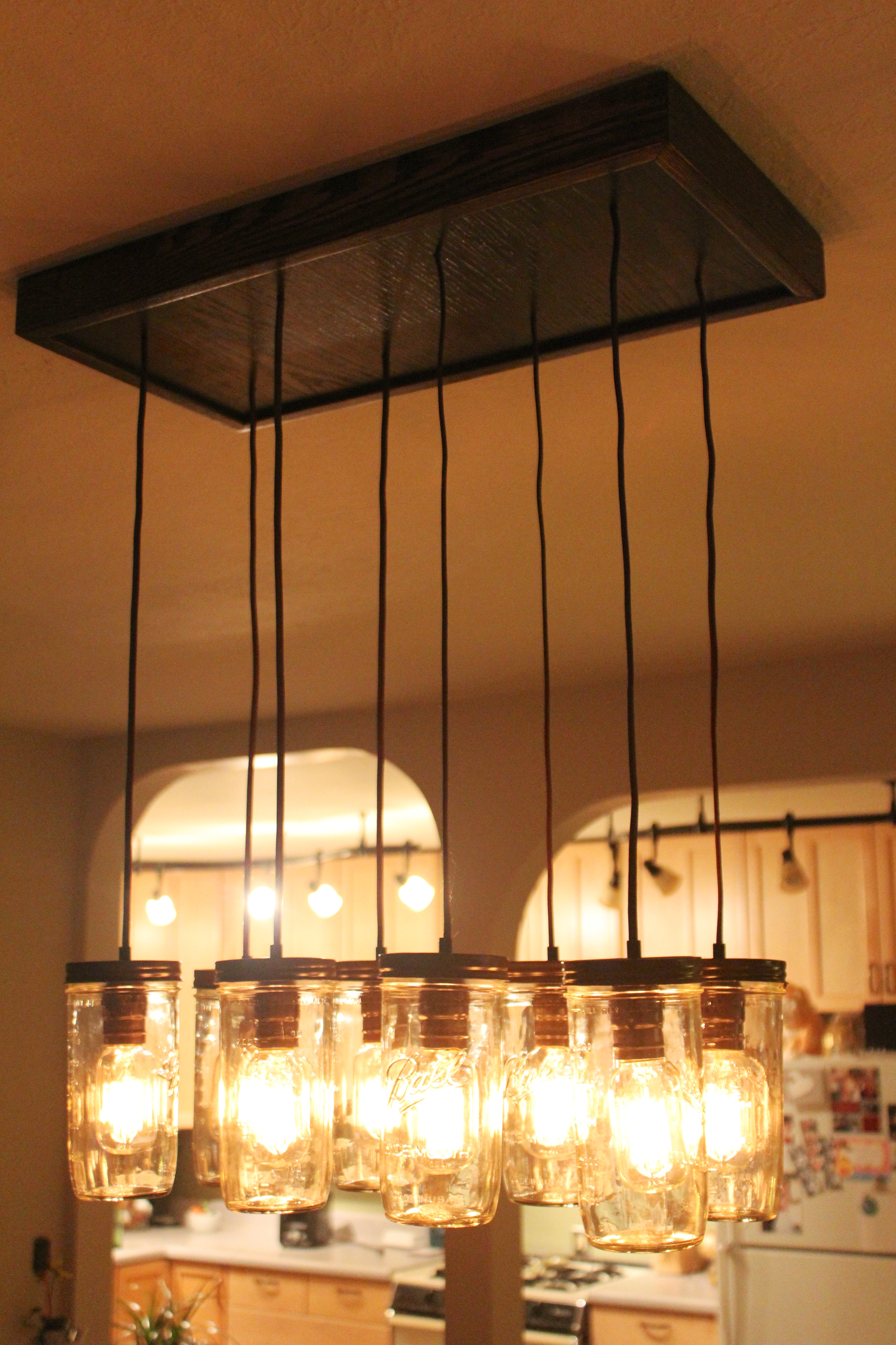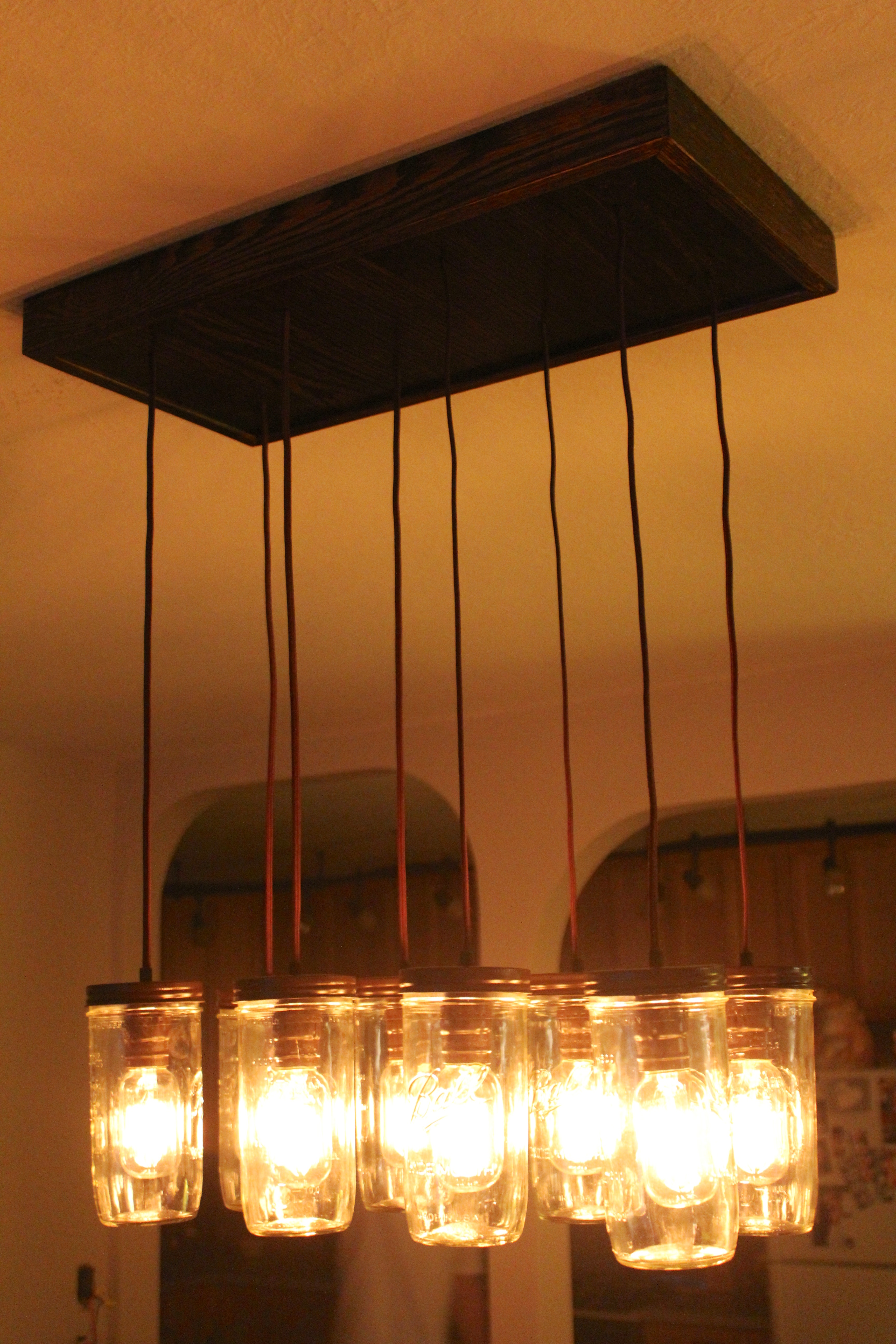 We had already decided where the chandelier was going to go, and had marked out exactly where the box would go on the ceiling. Now was the time to put it up! This was actually a relatively simple act, because Justin had designed it to be so. I just held up the box while Justin screwed it in, then slide in the second piece of the box to hide the wires, screws, junction box, etc., then we added the light bulbs, and finally the jars!