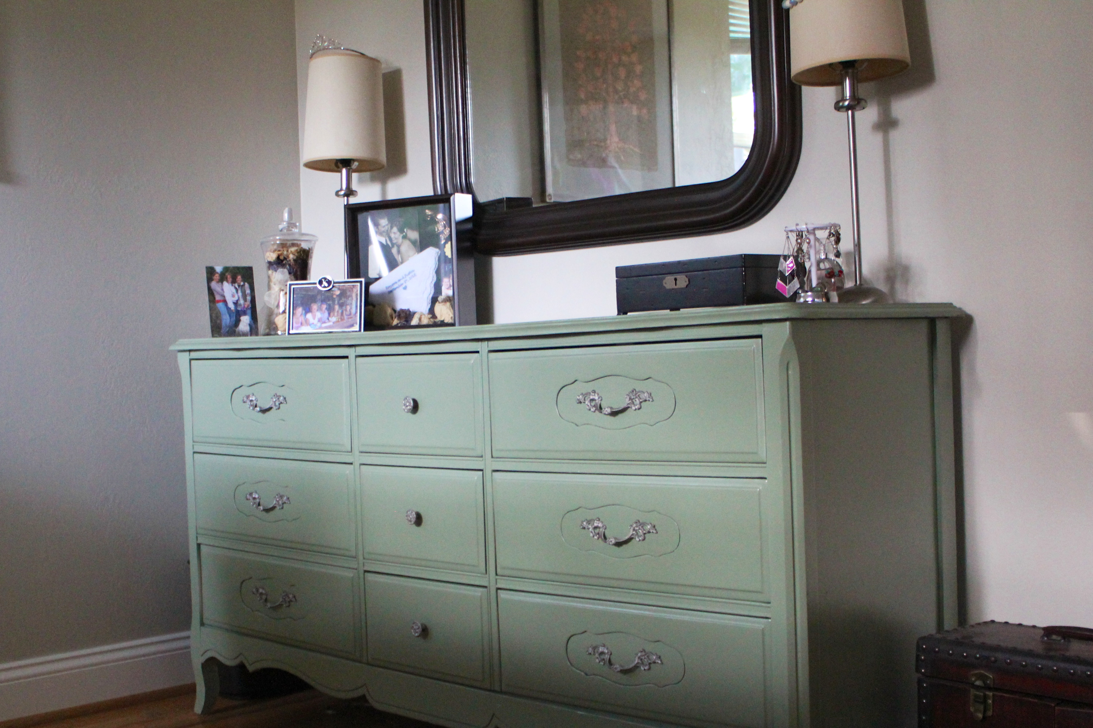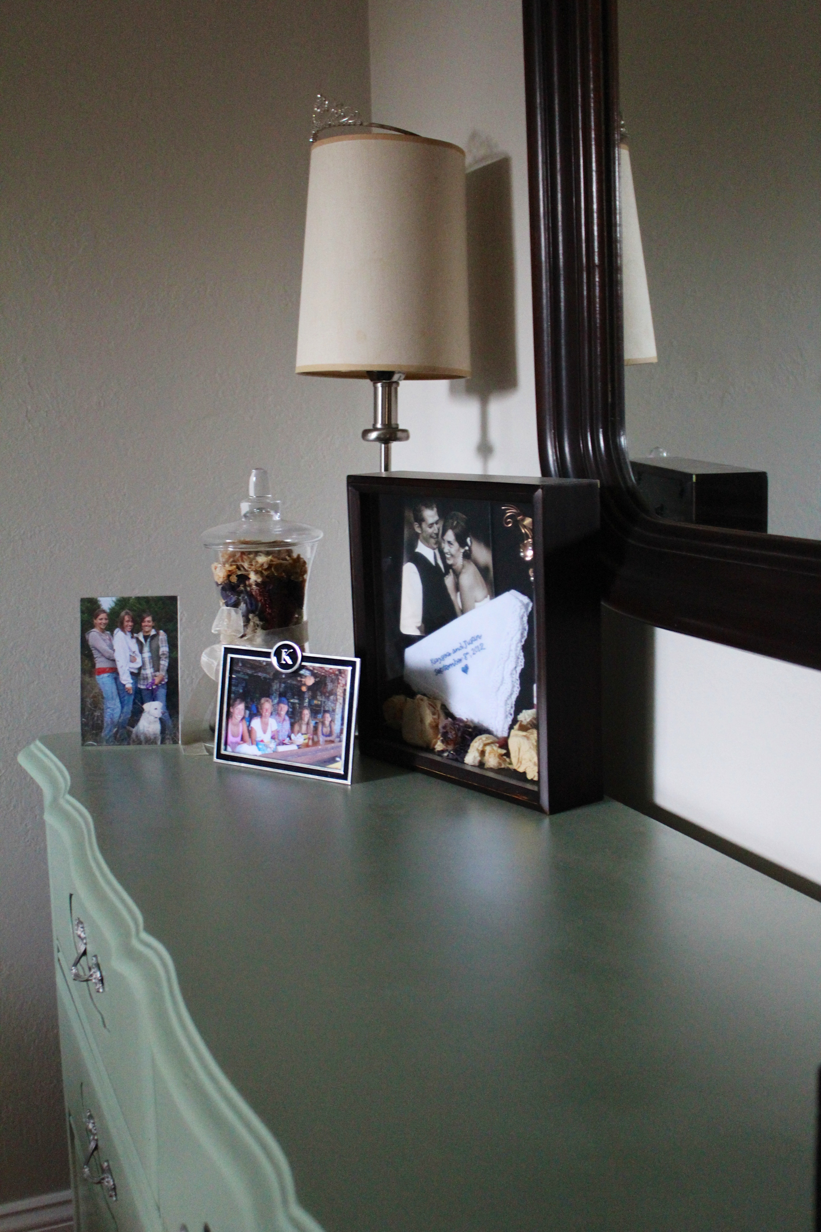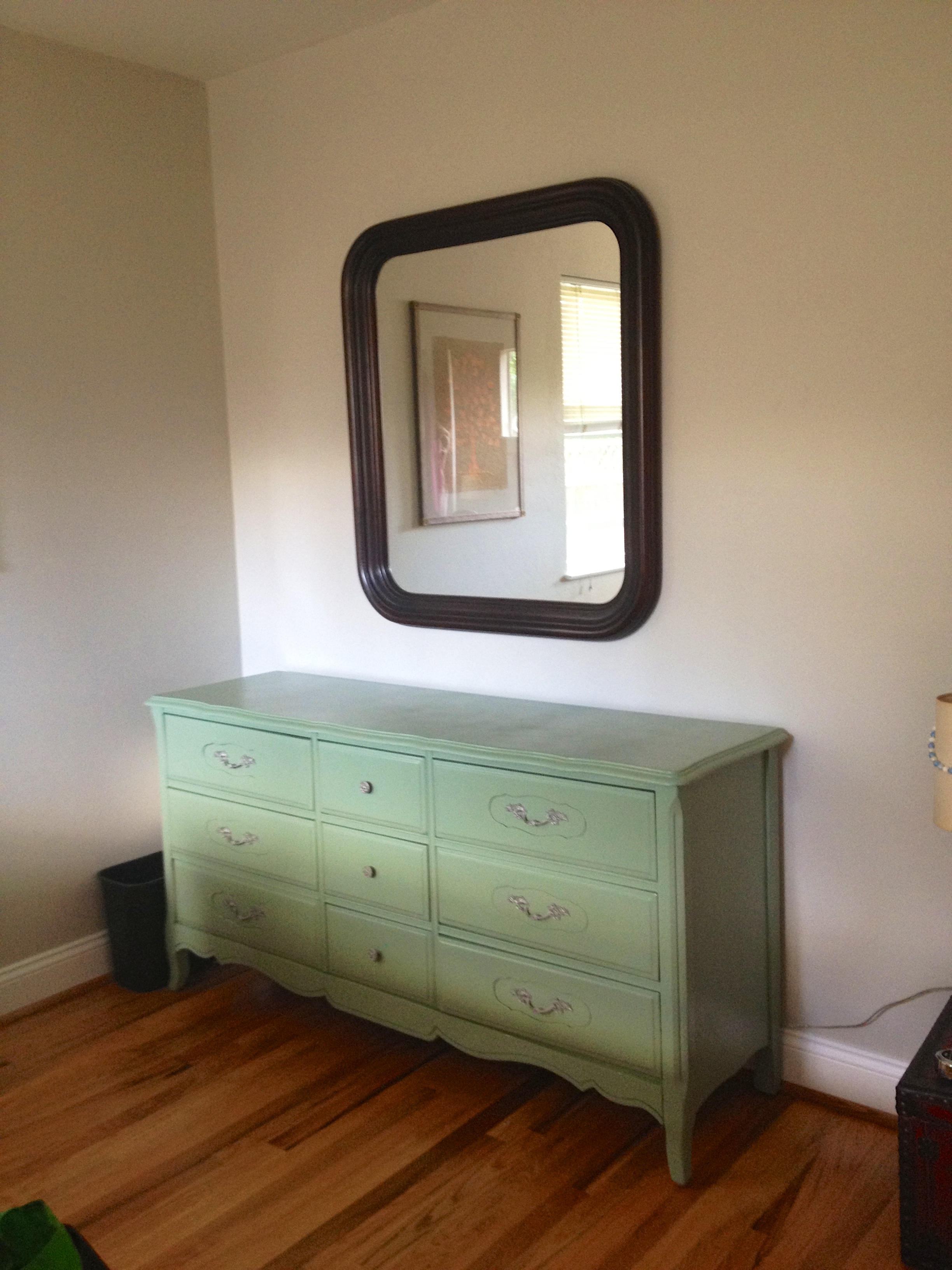 We swapped them out for this newly refurbished dresser and couldn’t be happier with the result. I love the pale green and the dark wood frame of the mirror. The high contrast (and the much needed pop of color) make this room look a lot less hodge podge and a lot more sophisticated.