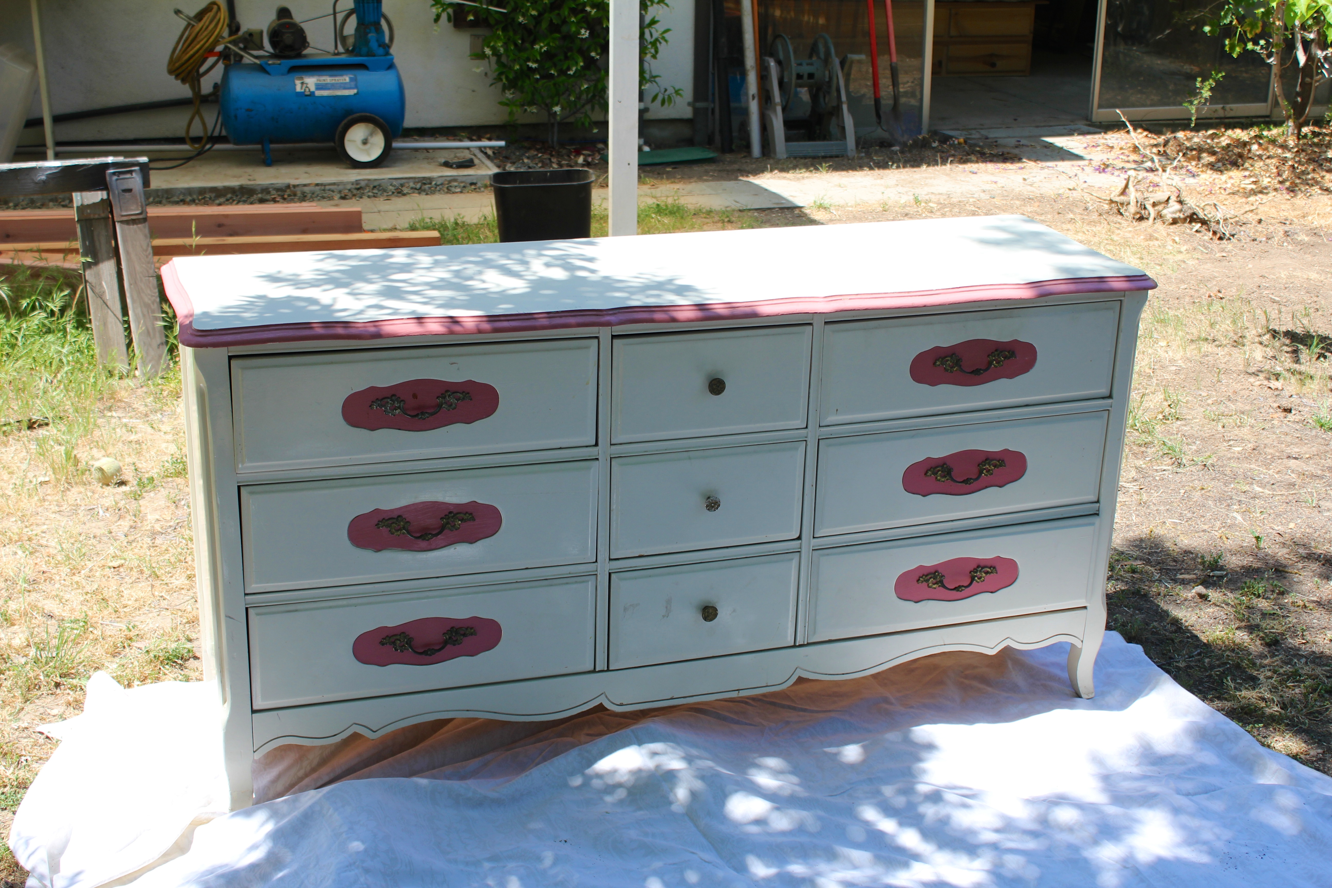 Nancy found us a sweet dresser at a garage sale that definitely needed some love. I don’t know about you, but we aren’t crazy about white and pink anything, much less white and pink furniture. Regardless of the heinous paint job, we could see the potential in this piece and were excited to clean it up.
