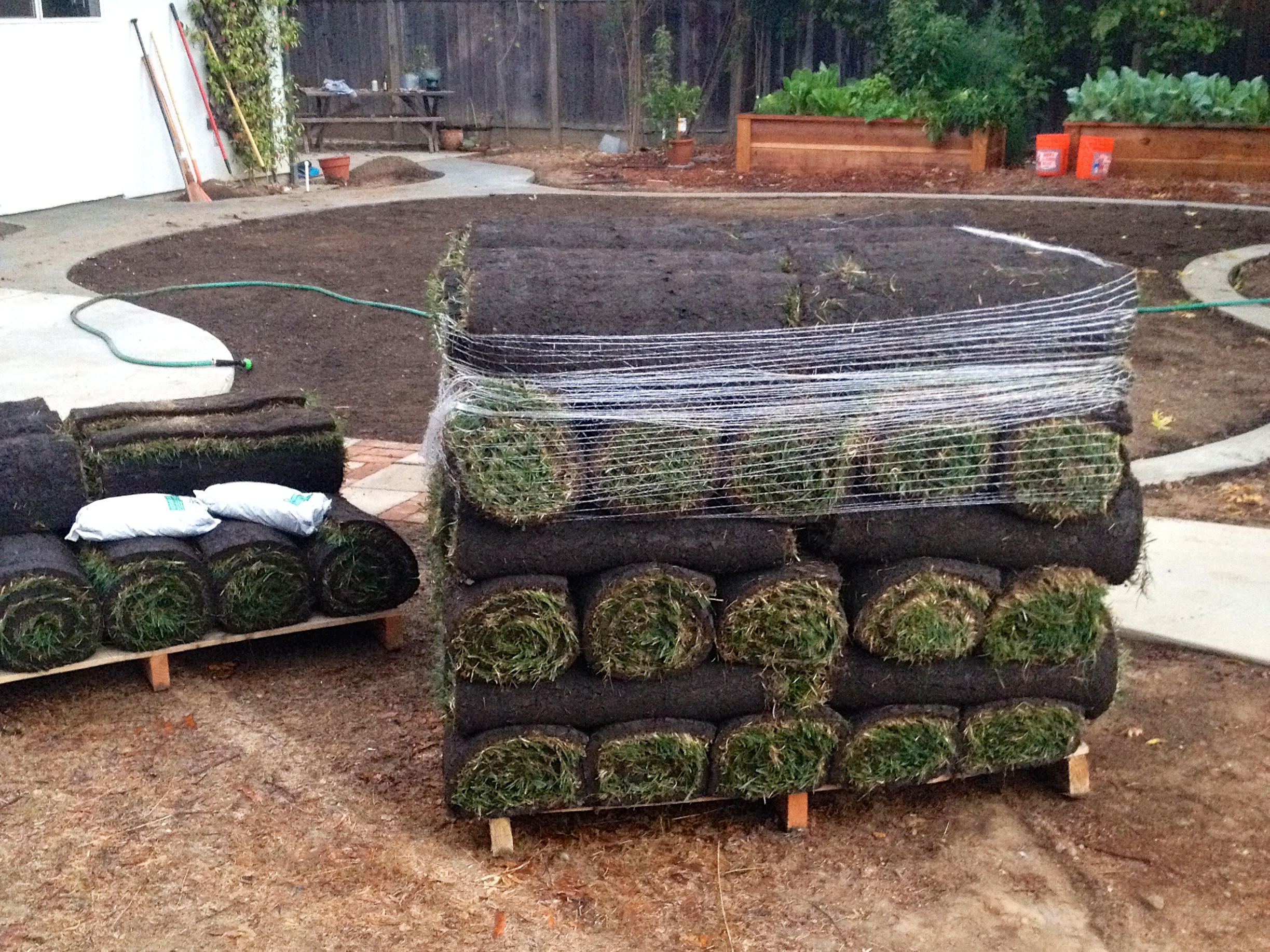 As for the details, it’s pretty simple. The delivery guy handed us a packet of fertilizer, which we sprinkled all around over the compost we had already put down. Then, you start unrolling. You develop a technique for meshing the pieces of sod together so the seams are less visible, but after a few weeks it’s impossible to tell where the piecing happened. And when you get to the end of a “row”, you sit yourself down, and saw off the remaining chunk of sod with a steak knife. No, really, you do… You can see me do this in the video a lot!