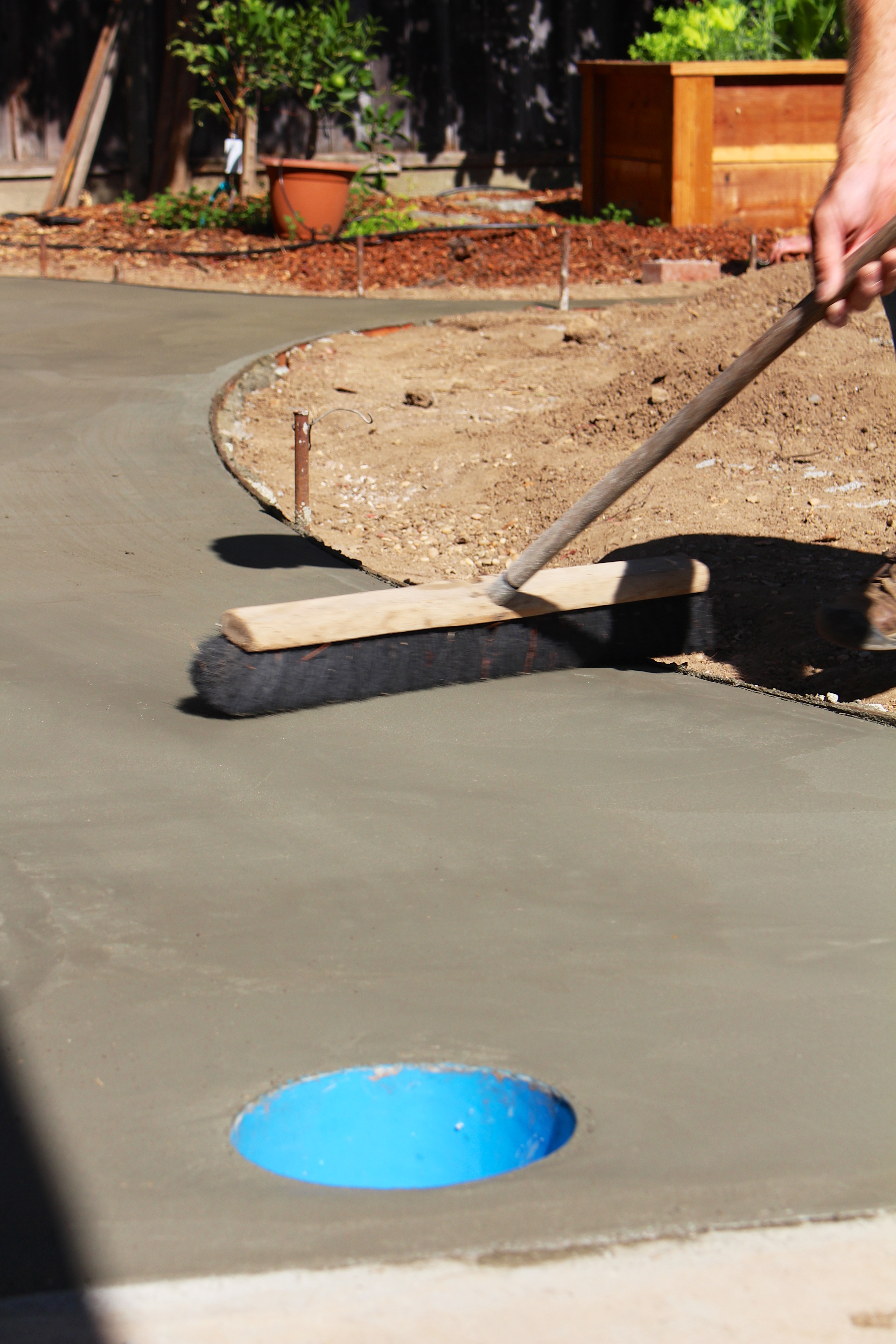 After the troweling was accomplished (hours and hours later) and the concrete was almost dry, we went back and brushed the concrete with an old broom to give it a little extra texture. And some handprints, because what concrete project is complete without handprints?