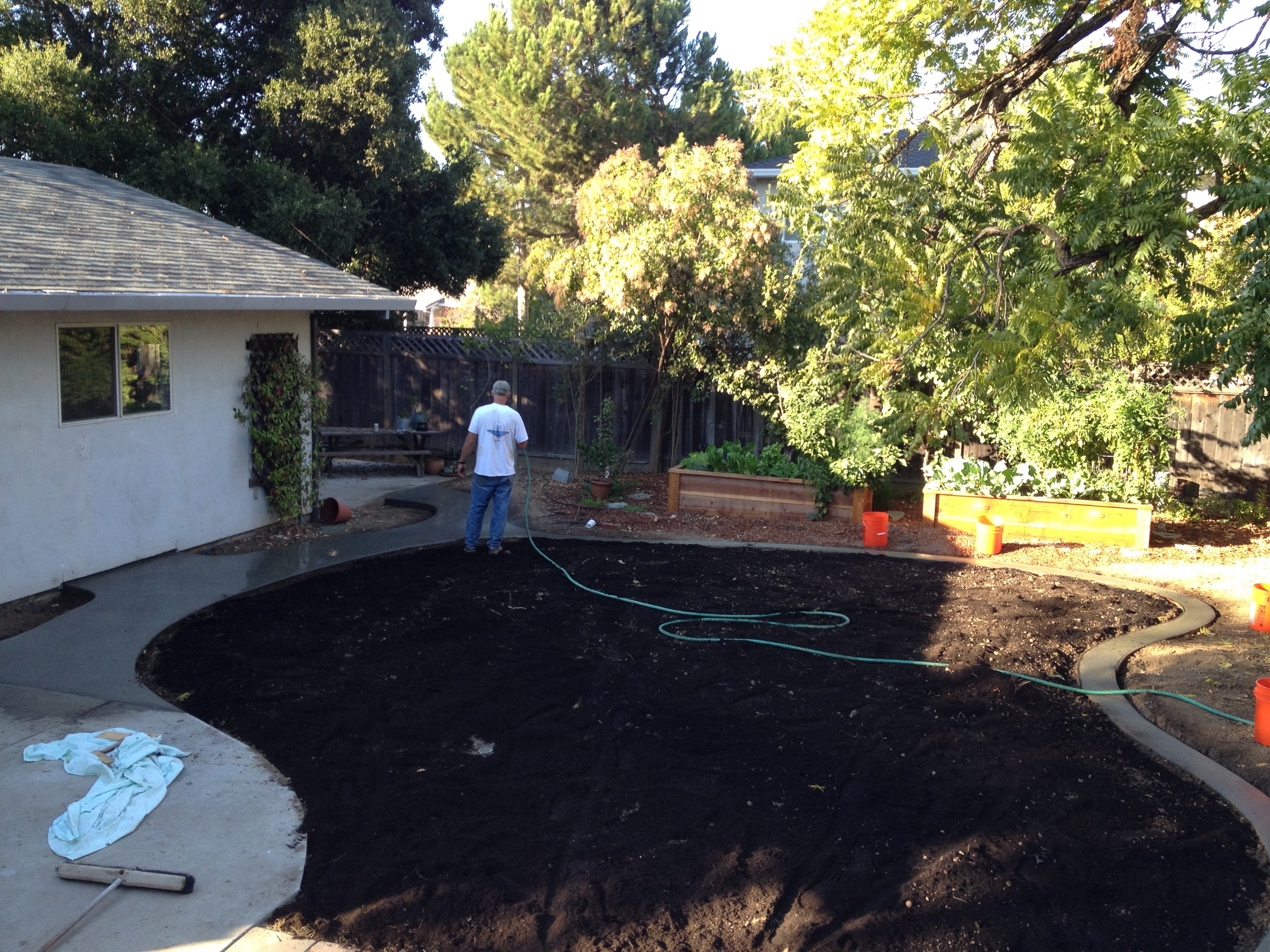 We kept watering down the concrete after all this was done, just to make sure it didn’t dry too fast and crack all over the place. We also went back to the rockery and got a giant pile of steaming, stinky compost so that our future grass would really take off and grow like crazy! And let me tell you, this stuff was rank. I apologize to our neighbors for that smell.