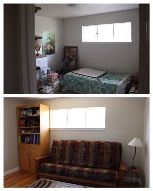 We were left with two perfectly functional unused dressers after stage one of the furniture shuffle. We decided to fill up an empty wall in the guest room with one dresser. See this bland empty wall? Even though the baseboards and paint look gorgeous, it was definitely lacking something…