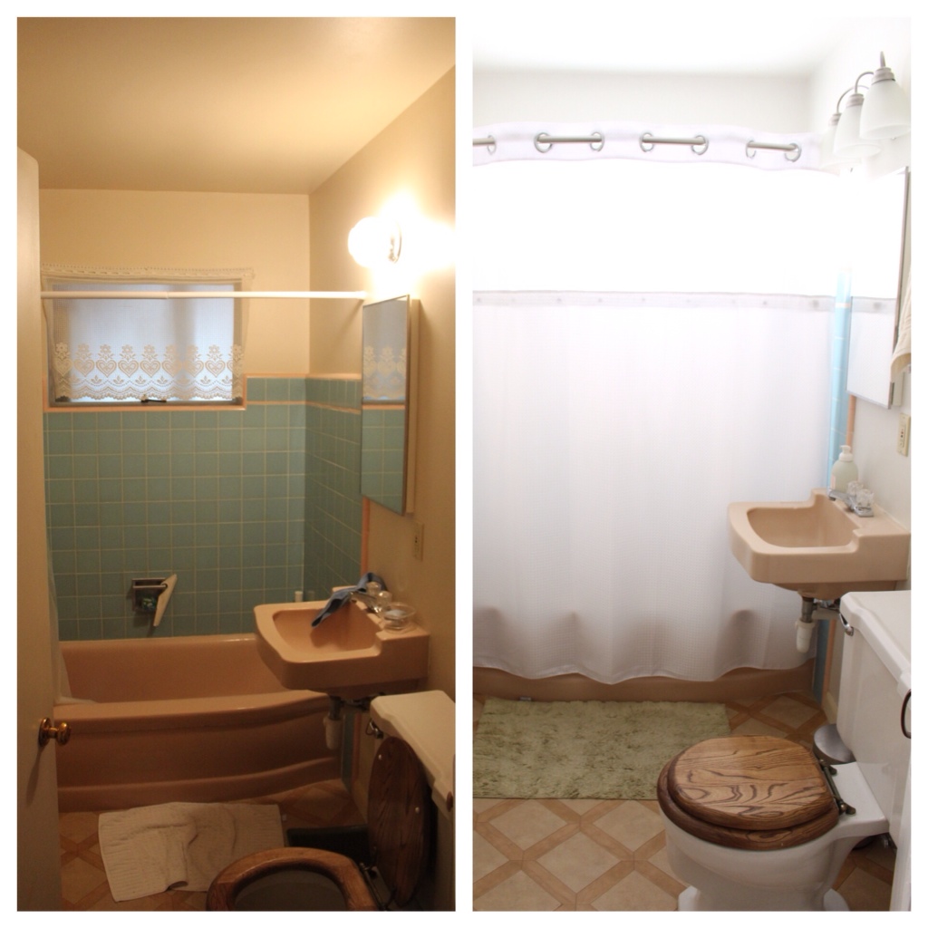- Installed a curved shower curtain rod and a bright white, cotton shower curtain (that really brightens things up!)